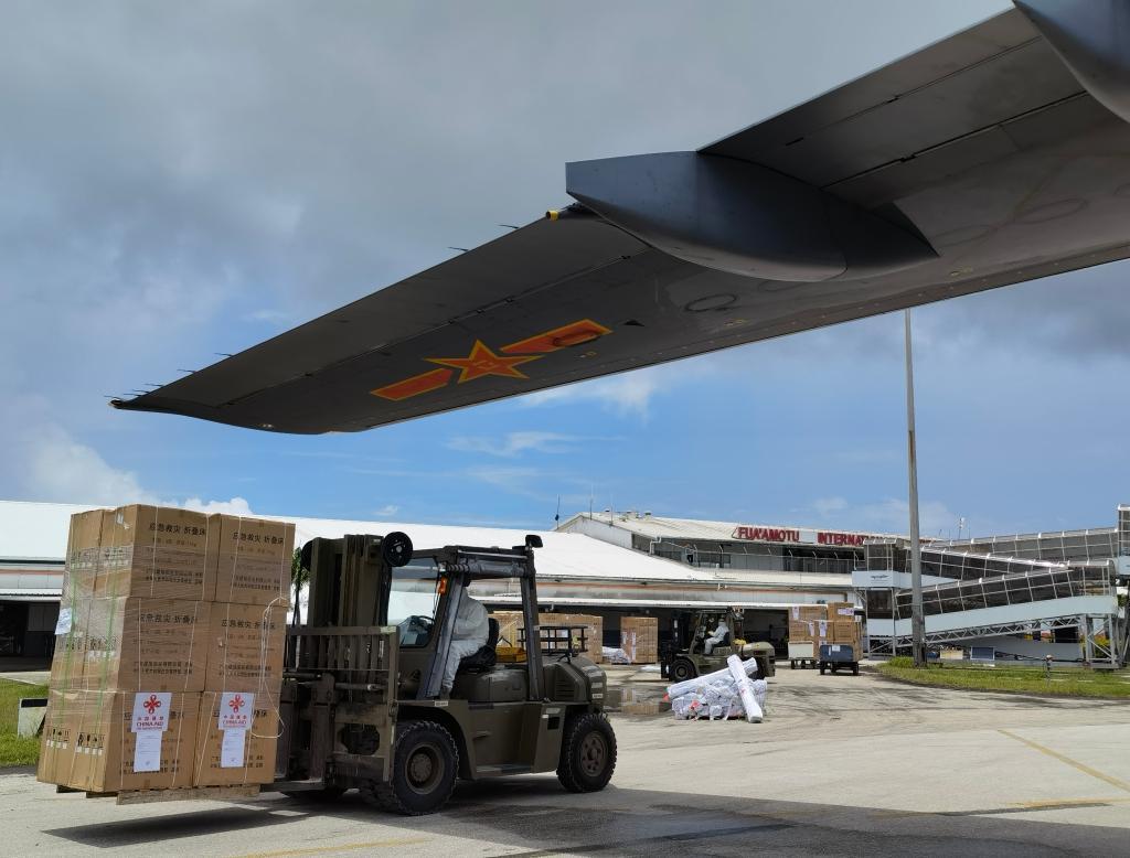 工作人員在湯加首都努庫阿洛法機場卸載中國運-20飛機運送來的援助物資(2022年1月28日攝,手機照片)。新華社記者 丁增義 攝