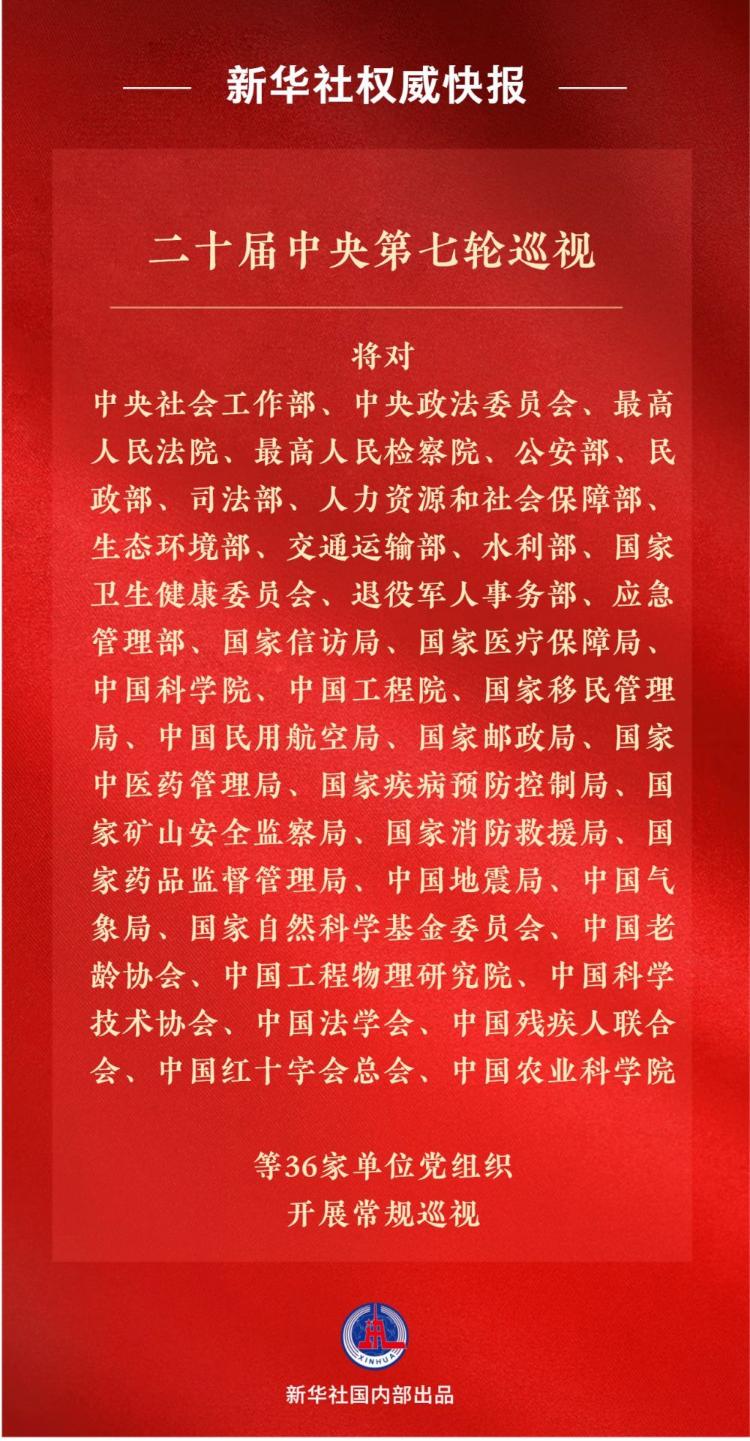 新華社北京4月8日電 經(jīng)黨中央批準(zhǔn),二十屆中央第七輪巡視將對(duì)中央社會(huì)工作部、中央政法委員會(huì)、最高人民法院、最高人民檢察院、公安部、民政部、司法部、人力資源和社會(huì)保障部、生態(tài)環(huán)境部、交通運(yùn)輸部、水利部、國(guó)家衛(wèi)生健康委員會(huì)、退役軍人事務(wù)部、應(yīng)急管理部、國(guó)家信訪局、國(guó)家醫(yī)療保障局、中國(guó)科學(xué)院、中國(guó)工程院、國(guó)家移民管理局、中國(guó)民用航空局、國(guó)家郵政局、國(guó)家中醫(yī)藥管理局、國(guó)家疾病預(yù)防控制局、國(guó)家礦山安全監(jiān)察局、國(guó)家消防救援局、國(guó)家藥品監(jiān)督管理局、中國(guó)地震局、中國(guó)氣象局、國(guó)家自然科學(xué)基金委員會(huì)、中國(guó)老齡協(xié)會(huì)、中國(guó)工程物理研究院、中國(guó)科學(xué)技術(shù)協(xié)會(huì)、中國(guó)法學(xué)會(huì)、中國(guó)殘疾人聯(lián)合會(huì)、中國(guó)紅十字會(huì)總會(huì)、中國(guó)農(nóng)業(yè)科學(xué)院等36家單位黨組織開展常規(guī)巡視。