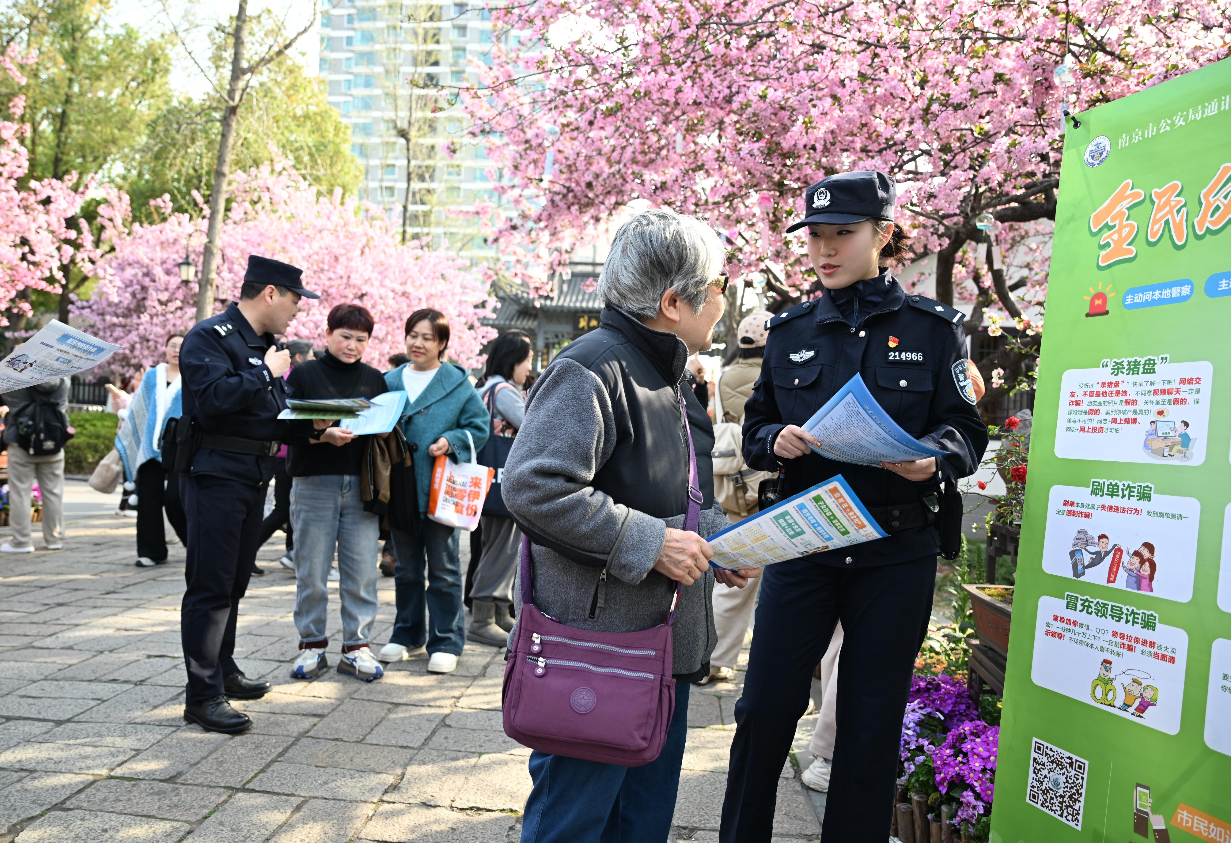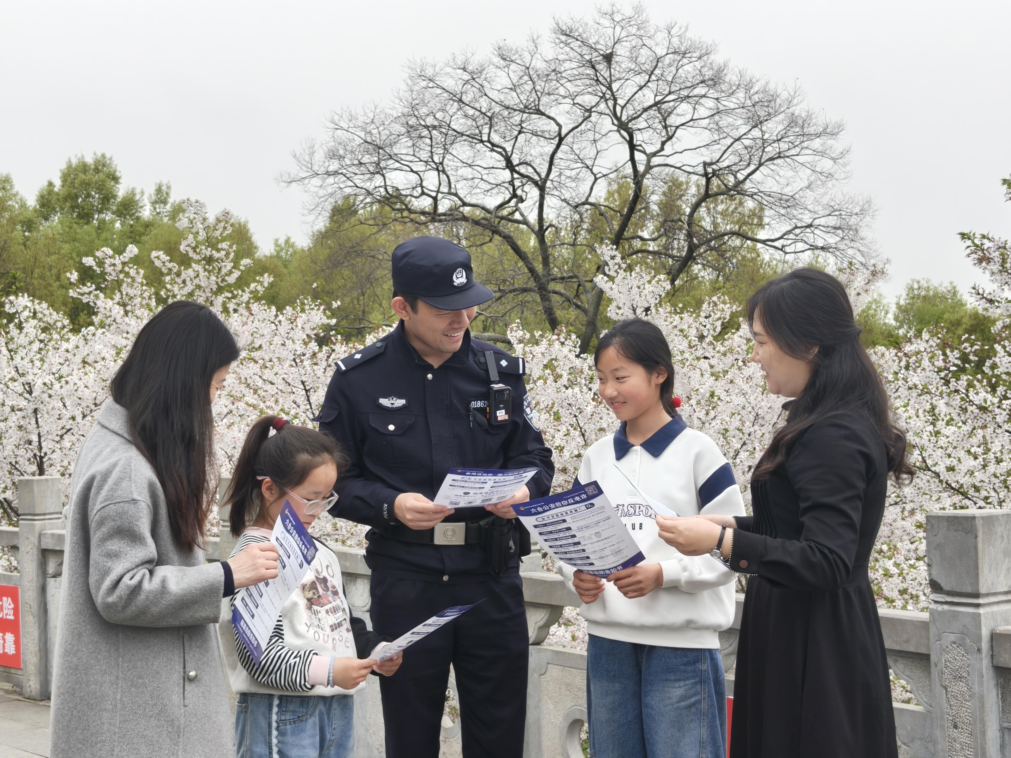 研學活動聚集地,不僅是安保的重點,也是反詐宣傳的“黃金陣地”。南京警方抓住假期人流集中的契機,將反詐宣傳陣地前移至家長和孩子們身邊?!鞍⒁?,手機支付停車費要小心陌生鏈接!”“小朋友,說送你游戲皮膚的千萬別信!”在莫愁湖公園海棠花會,建鄴公安分局民警將反詐知識融入春日游園,游客一邊賞花一邊聽防騙知識。
