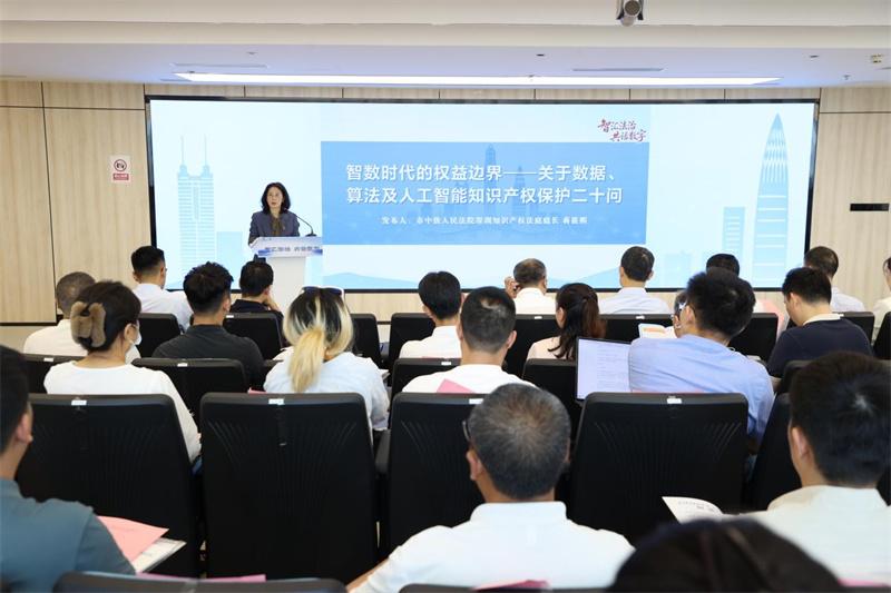 活動(dòng)伊始,市中級(jí)人民法院深圳知識(shí)產(chǎn)權(quán)法庭庭長(zhǎng)蔣筱熙發(fā)布《智數(shù)時(shí)代的權(quán)益邊界——關(guān)于數(shù)據(jù)、算法及人工智能知識(shí)產(chǎn)權(quán)保護(hù)二十問》(以下簡(jiǎn)稱《二十問》)?!抖畣枴肪o扣企業(yè)經(jīng)營(yíng)和產(chǎn)業(yè)發(fā)展中的數(shù)據(jù)、人工智能相關(guān)痛點(diǎn),聚焦數(shù)據(jù)抓取合法性、算法商業(yè)秘密保護(hù)、AI生成內(nèi)容權(quán)利歸屬等高頻問題,將宏觀法律原則轉(zhuǎn)化為具體實(shí)踐指引,為企業(yè)提供“看得懂、用得上”的法律導(dǎo)航,打通立法原則與企業(yè)合規(guī)實(shí)踐的“最后一公里”。隨后,深圳知識(shí)產(chǎn)權(quán)法庭法官?gòu)堟媒庾x了《二十問》的起草背景與依據(jù),從法理、司法方法、產(chǎn)業(yè)實(shí)踐等方面進(jìn)行系統(tǒng)化闡釋。