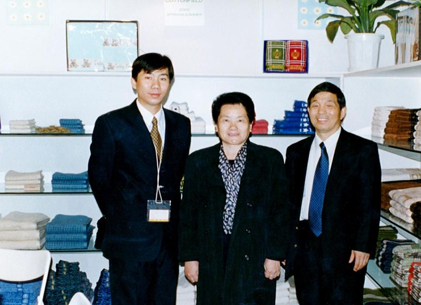 2000年3月北京中國國際紡織品博覽會上,原中國紡織工業(yè)部部長吳文英(中)、原中國家用紡織品協(xié)會會長楊東輝(右)在南華實業(yè)公司展位前與馬濤(左)合影。展位商品所使用的標識即為“無印良品”。