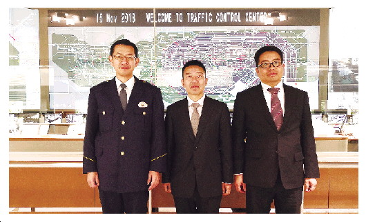 圖為本報(bào)記者蒲建安(中)在日本東京交通管制中心采訪,了解東京治理交通擁堵的對(duì)策。