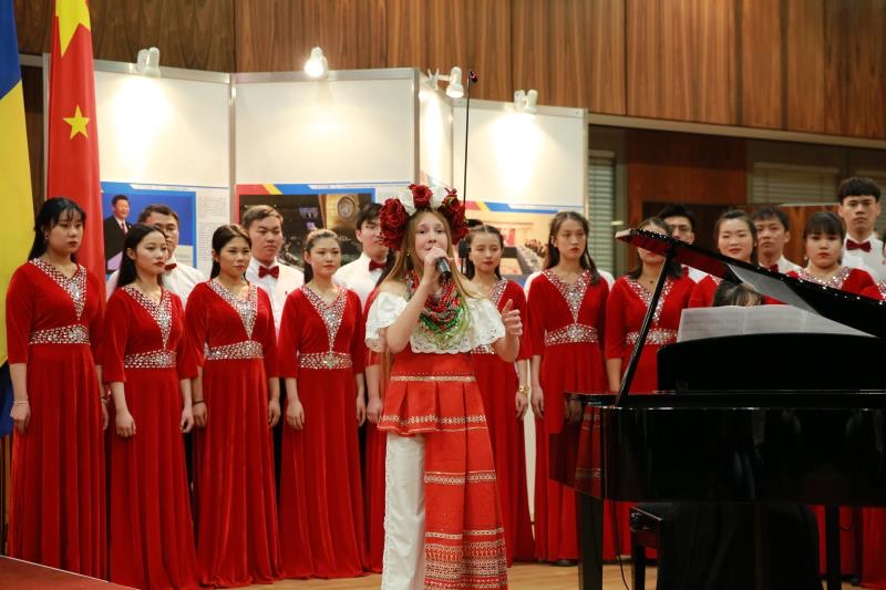 中國留學(xué)生藝術(shù)團合唱隊用中烏雙語演唱兩國國歌。
