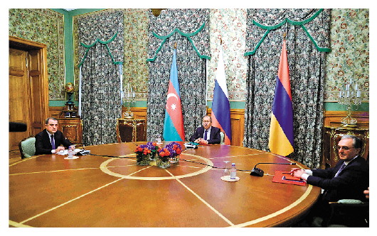 圖①為俄羅斯、阿塞拜疆、亞美尼亞三國(guó)外長(zhǎng)會(huì)晤討論納卡問(wèn)題。 CFP供圖
