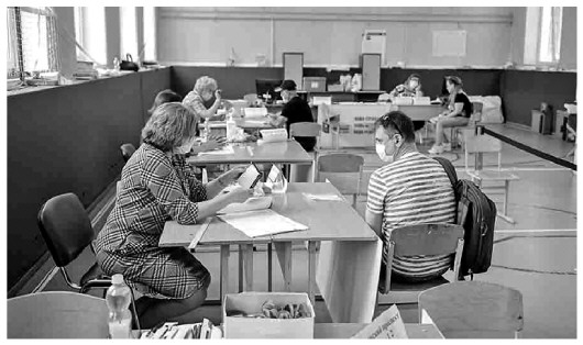 圖為2020年7月1日,俄選民在首都莫斯科一處投票站登記注冊并就憲法修正案草案進行投票。 新華社發(fā)