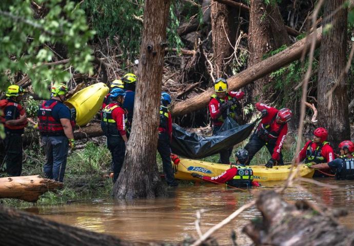7月7日,救援人員在美國得克薩斯州英格勒姆遭洪水侵襲的區(qū)域搬運(yùn)遇難者的遺體。新華社/美聯(lián)