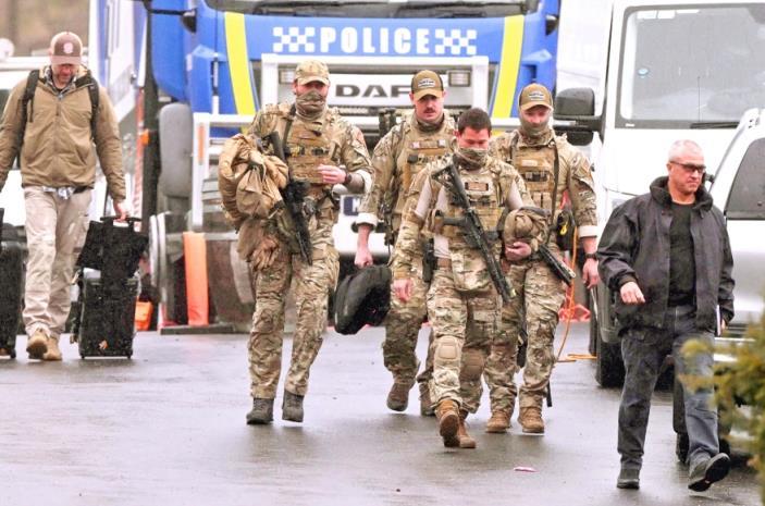 圖為當(dāng)?shù)貢r(shí)間2025年8月28日,澳大利亞波爾潘卡,在搜捕一名與警察遭槍手槍殺案有關(guān)的逃犯期間,全副武裝的警察聚集在警務(wù)集結(jié)點(diǎn)。 CFP供圖
