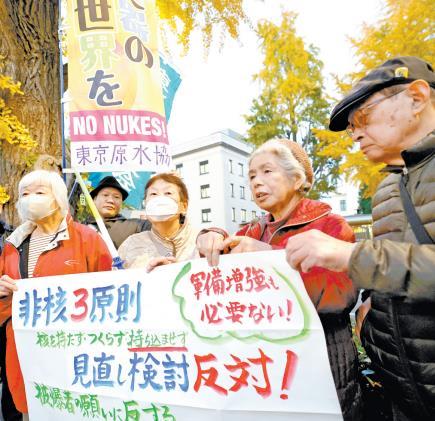 圖為當(dāng)?shù)貢r(shí)間11月21日,日本原子彈氫彈爆炸受害者團(tuán)體協(xié)議會(huì)等組織在日本國(guó)會(huì)前舉行抗議活動(dòng),反對(duì)修改“無(wú)核三原則”和加強(qiáng)軍備。 CFP供圖