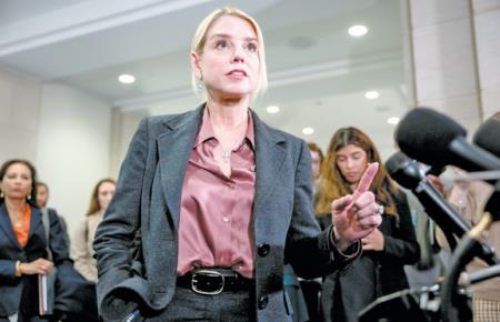 當(dāng)?shù)貢r(shí)間3月18日,美國司法部長帕姆·邦迪在國會(huì)山向眾議院監(jiān)督與政府改革委員會(huì)成員通報(bào)對(duì)愛潑斯坦案的調(diào)查情況后,與記者交談。 CFP供圖