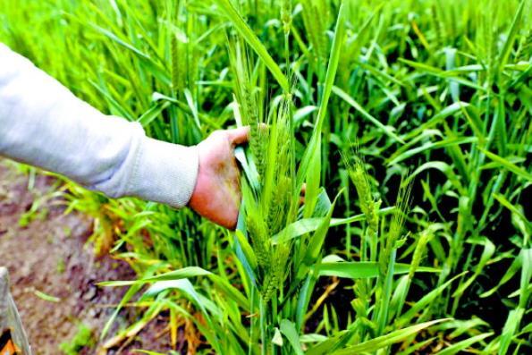 圖為農(nóng)民在埃及蓋勒尤卜省的農(nóng)田中展示因化肥供應受阻而長勢不佳的麥穗。 新華社發(fā)(艾哈邁德·戈馬 攝)