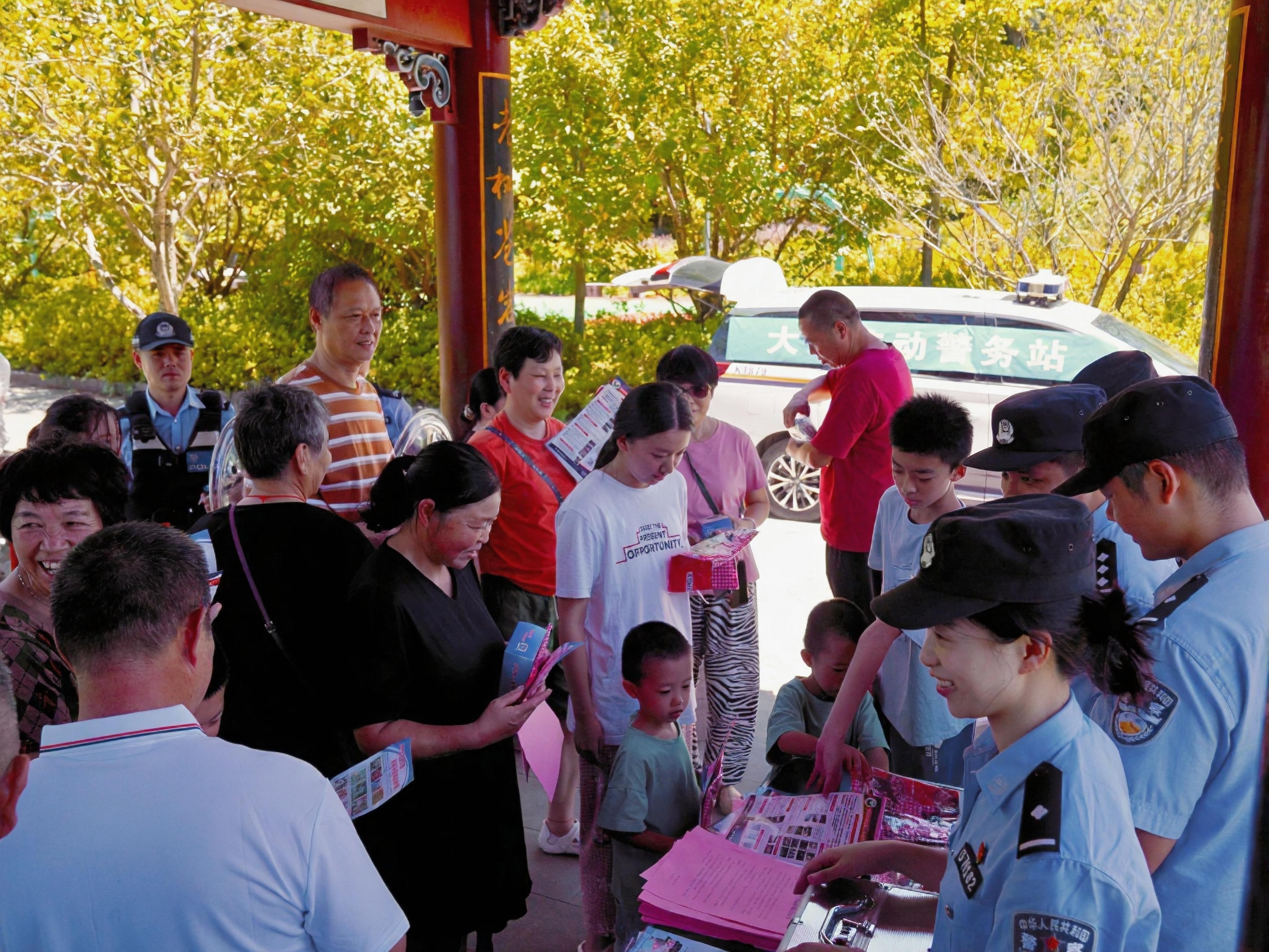 盛夏七月,海拔近千米的大洋鎮(zhèn)迎來避暑客流高峰。綠林中的大洋水庫(kù)旁新設(shè)的“警務(wù)涼亭”成了游客歇腳點(diǎn)。7月14日中午,民警張洵正向圍坐的游客遞上涼茶,普及反詐知識(shí)。