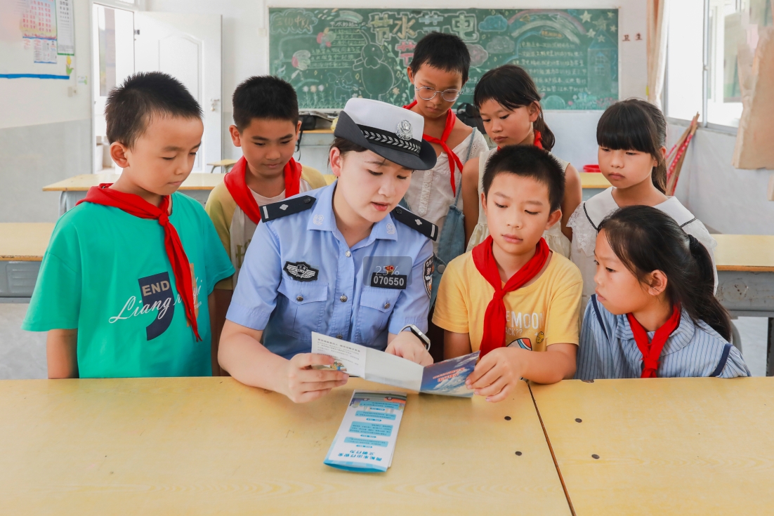 圖為9月2日,民警在章貢區(qū)水西鎮(zhèn)石甫小學(xué)向同學(xué)們講解交通安全知識。