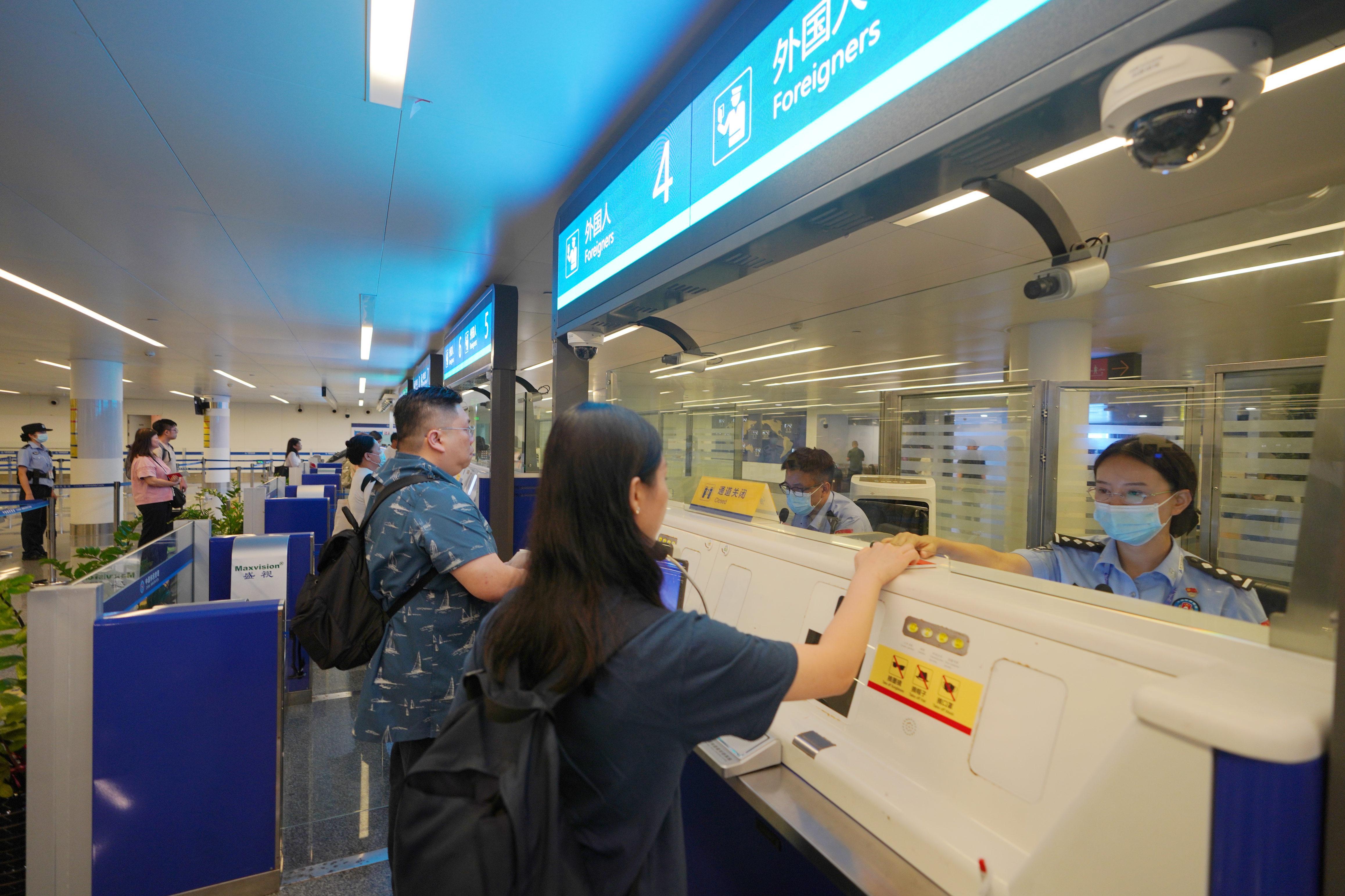 圖為“朱槿花服務(wù)隊(duì)”隊(duì)員對(duì)入境的參展客商進(jìn)行證件查驗(yàn)。梁簫 攝