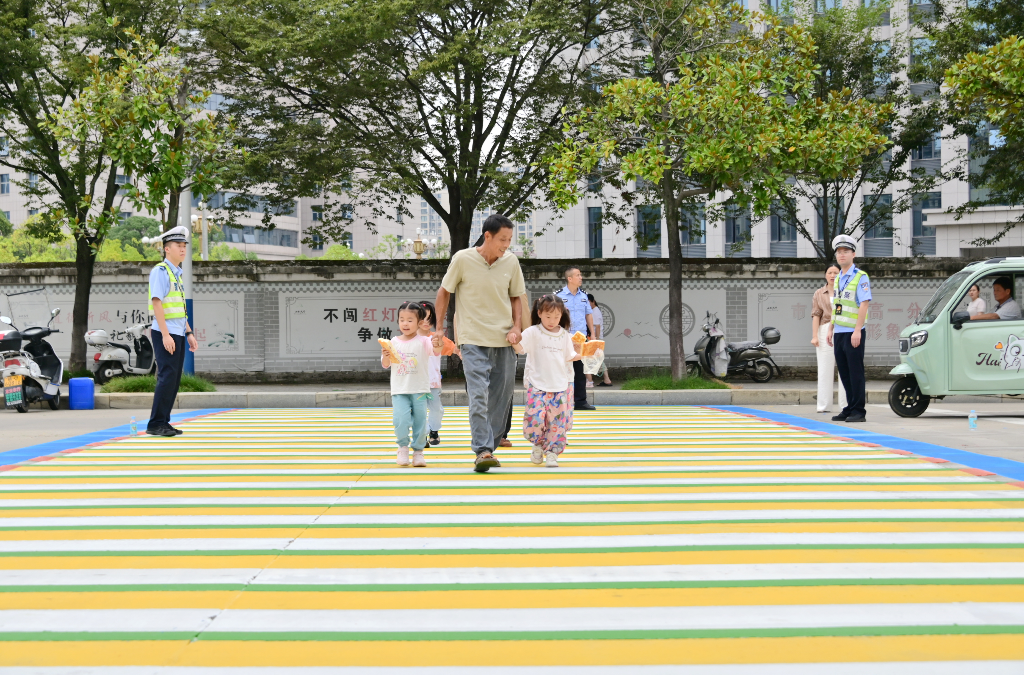 9月23日,由紅、黃、藍(lán)、綠、白五色噴涂構(gòu)建的3D立體多彩斑馬線,在江西省武寧縣多個(gè)校園門(mén)口及附近完成施劃作業(yè)并正式“亮相”街頭。