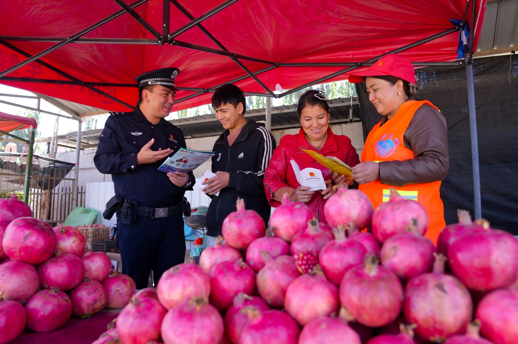 10月12日,新疆維吾爾自治區(qū)葉城縣伯西熱克鎮(zhèn)派出所深入踐行新時代“楓橋經(jīng)驗”,組織“石榴大媽”“石榴義警”等走進(jìn)轄區(qū)石榴園區(qū)、流動擺攤路段、合作社及打包點等地,開展常態(tài)化巡邏防控、安全隱患排查、安防普法宣傳和矛盾糾紛調(diào)處工作。民警與義警向群眾講解防盜防騙、交通安全等知識,及時掌握社情民意,化解潛在風(fēng)險,用實際行動守護(hù)群眾生命財產(chǎn)安全。