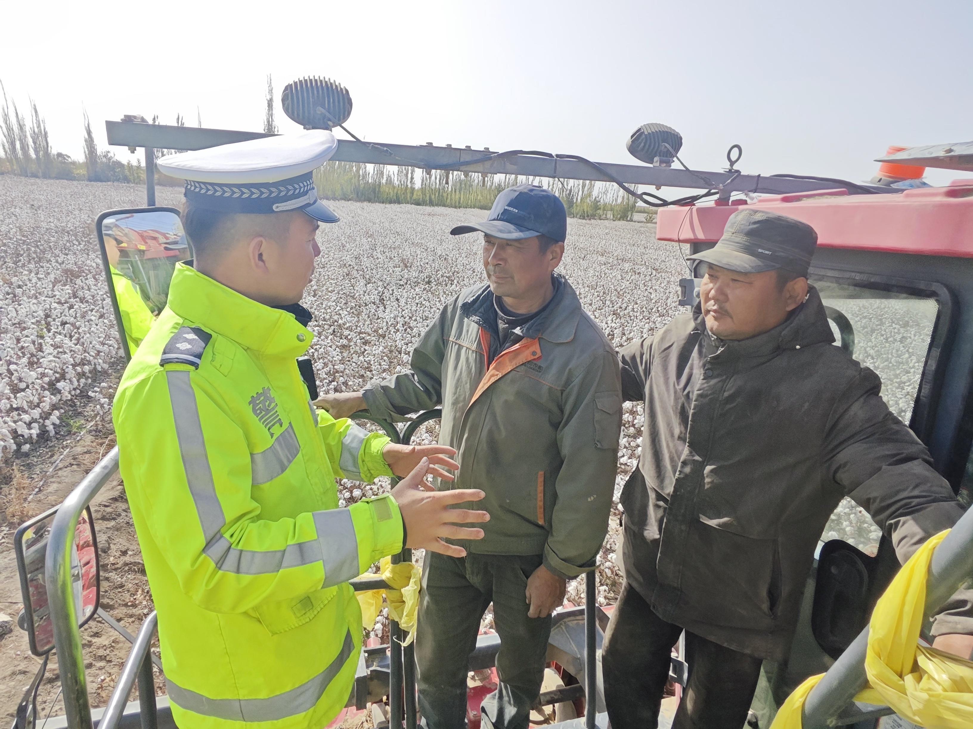 金秋時節(jié),新疆庫爾勒市120萬畝棉花迎來采收旺季。10月21日,庫爾勒市公安局交通管理大隊庫普路中隊大力開展“護航到棉田、上門送安全”交通安全主題宣講活動,民警面對面向群眾送法律、送安全、送服務(wù),提升大家知危險會避險和自我保護能力,全力維護農(nóng)村交通安全形勢平穩(wěn),確保棉花順利采收和安全運輸。
