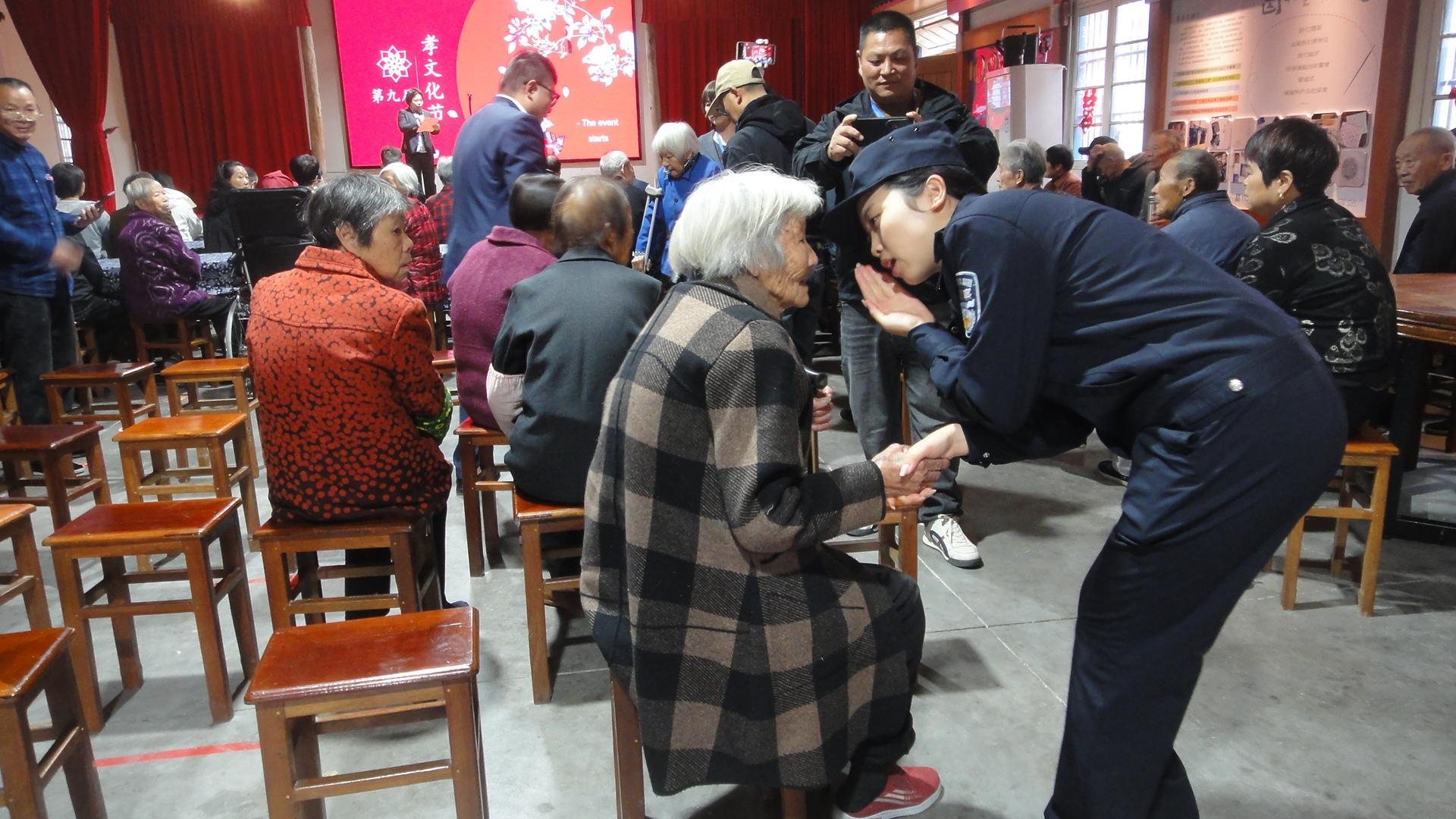 10月28日,浙江省東陽(yáng)市公安局虎鹿派出所民警趕到葛宅村,在重陽(yáng)節(jié)表彰“好婆婆”“好媳婦”活動(dòng)現(xiàn)場(chǎng),與老人親熱互動(dòng),宣講防范養(yǎng)老詐騙等安全知識(shí),共同弘揚(yáng)傳承孝道文化。