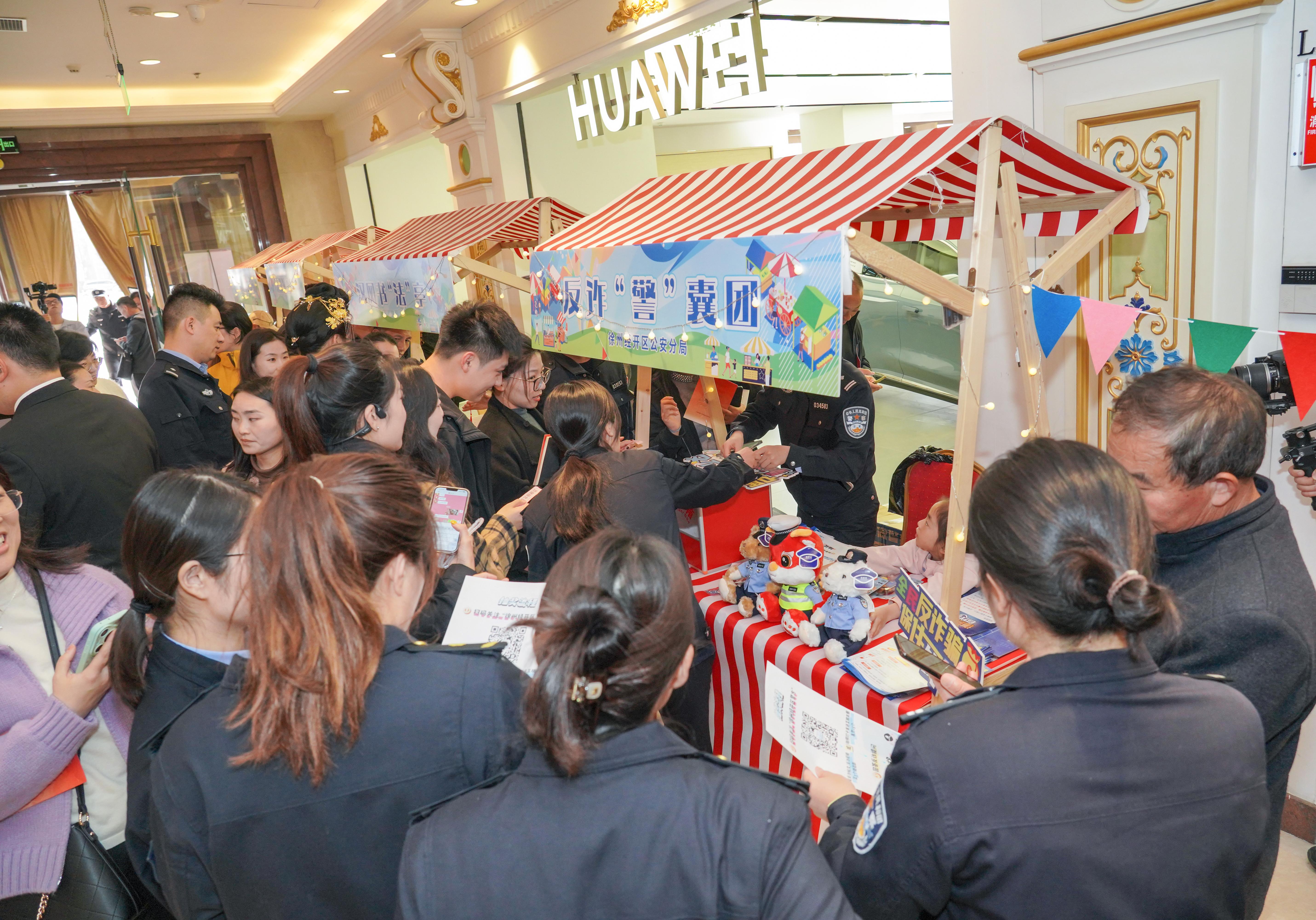 活動現(xiàn)場,商場內(nèi)外大屏滾動播放的徐州市“八五”普法宣傳片,吸引了眾多顧客駐足觀看。法治文化作品展區(qū)展示著優(yōu)秀的法治主題書畫作品,普法市集上,公安、檢察、法院、律師等普法宣傳和咨詢攤位前圍滿了咨詢的市民。現(xiàn)場還設(shè)置了六大非遺攤位,面塑捏出的卡通公檢法小熊、糖畫制成的天平、扎染作品上的法治圖案吸引著眾多目光,書法攤位面前排著長隊(duì),書法家正在現(xiàn)場書寫送給市民的伴手禮。