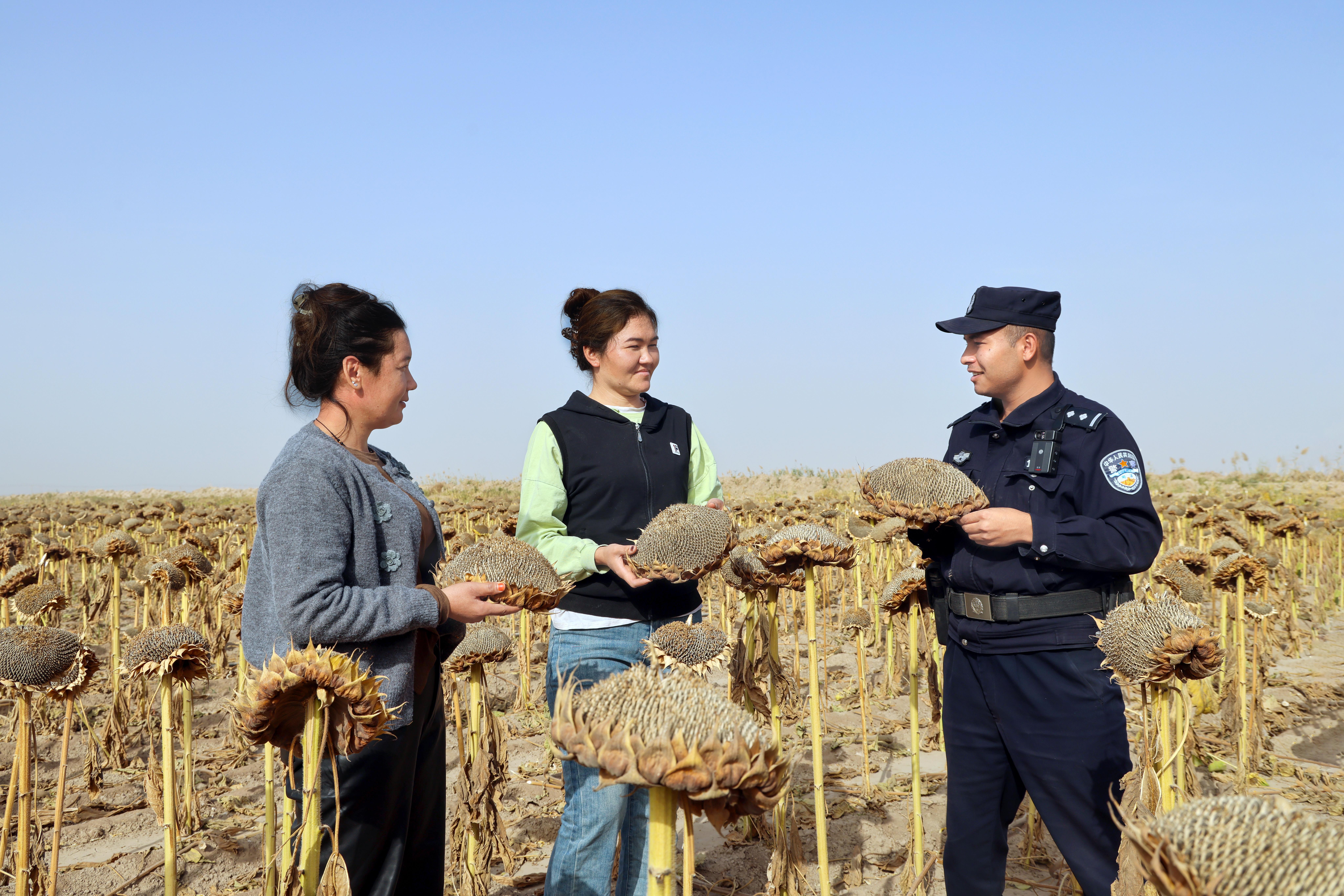 10月29日,新疆巴楚縣萬(wàn)畝食葵迎來(lái)采收高峰。在恰爾巴格鄉(xiāng)庫(kù)木加依村的田間地頭,連片的食葵垂下飽滿的花盤,收割機(jī)的轟鳴聲與人們的歡笑聲此起彼伏,處處洋溢著豐收的喜悅。在這片金黃畫(huà)卷中,一群身著藏藍(lán)警服的身影格外醒目——巴楚縣公安局成立的“秋收服務(wù)隊(duì)”的民輔警正忙碌其間,他們不僅助力采收解民憂,更將反詐知識(shí)帶到生產(chǎn)一線,實(shí)現(xiàn)“秋收+反詐”的雙贏局面。