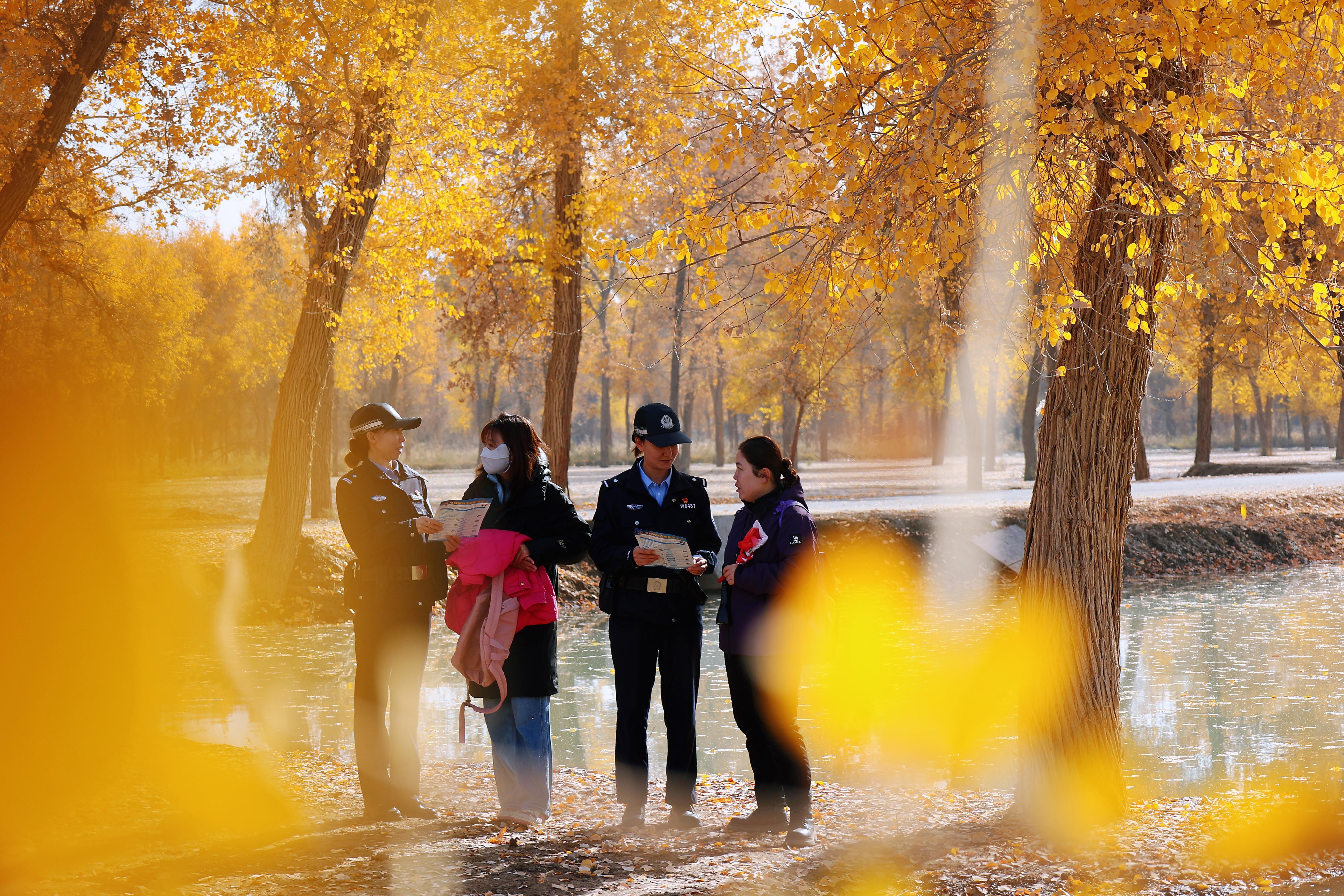 為進(jìn)一步筑牢景區(qū)安全防線、提升游客法治意識,11月3日,新疆維吾爾自治區(qū)阿瓦提縣公安局啟動旅游警務(wù),該局環(huán)境資源和食品藥品犯罪偵查大隊聯(lián)合刀郎部落景區(qū)警務(wù)室民警,開展普法宣傳活動?;顒又校窬捎貌窖?、車巡、空巡相結(jié)合的巡防模式,同步推進(jìn)智慧巡防、安全隱患排查、矛盾糾紛化解、便民服務(wù)供給與法治宣傳引導(dǎo)等多項工作,以全方位、精細(xì)化的服務(wù)舉措,為游客營造安全、有序、和諧的環(huán)境。