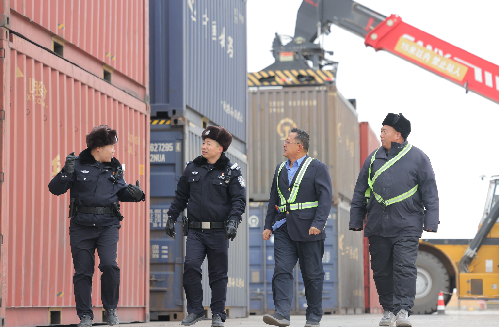 圖為烏魯木齊鐵路公安局庫爾勒公安處依吞布拉克站派出所民警到轄區(qū)貨場進行安全生產(chǎn)檢查。
