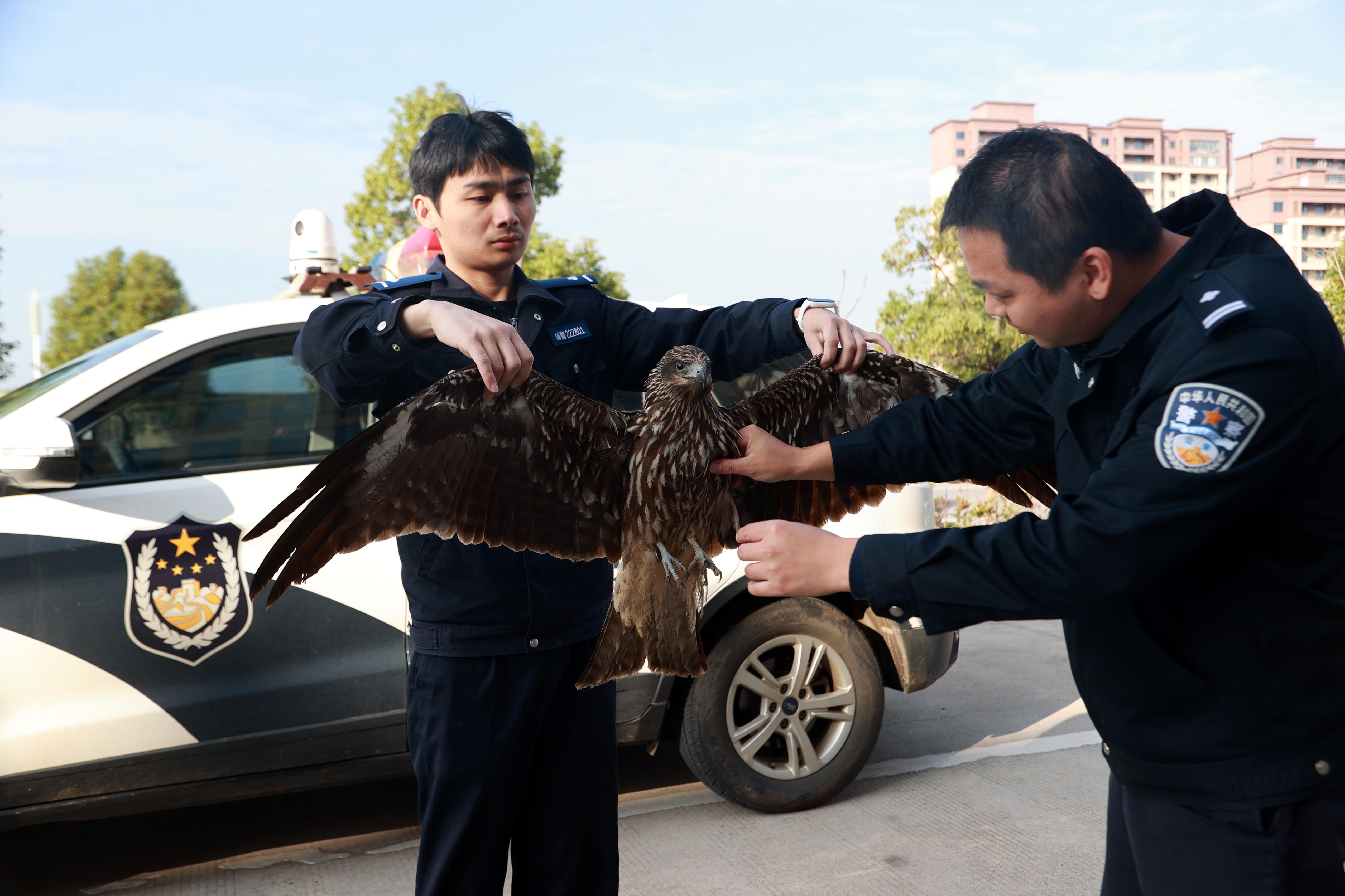 圖為民輔警對(duì)受傷的蒼鷹進(jìn)行觀察、救治。