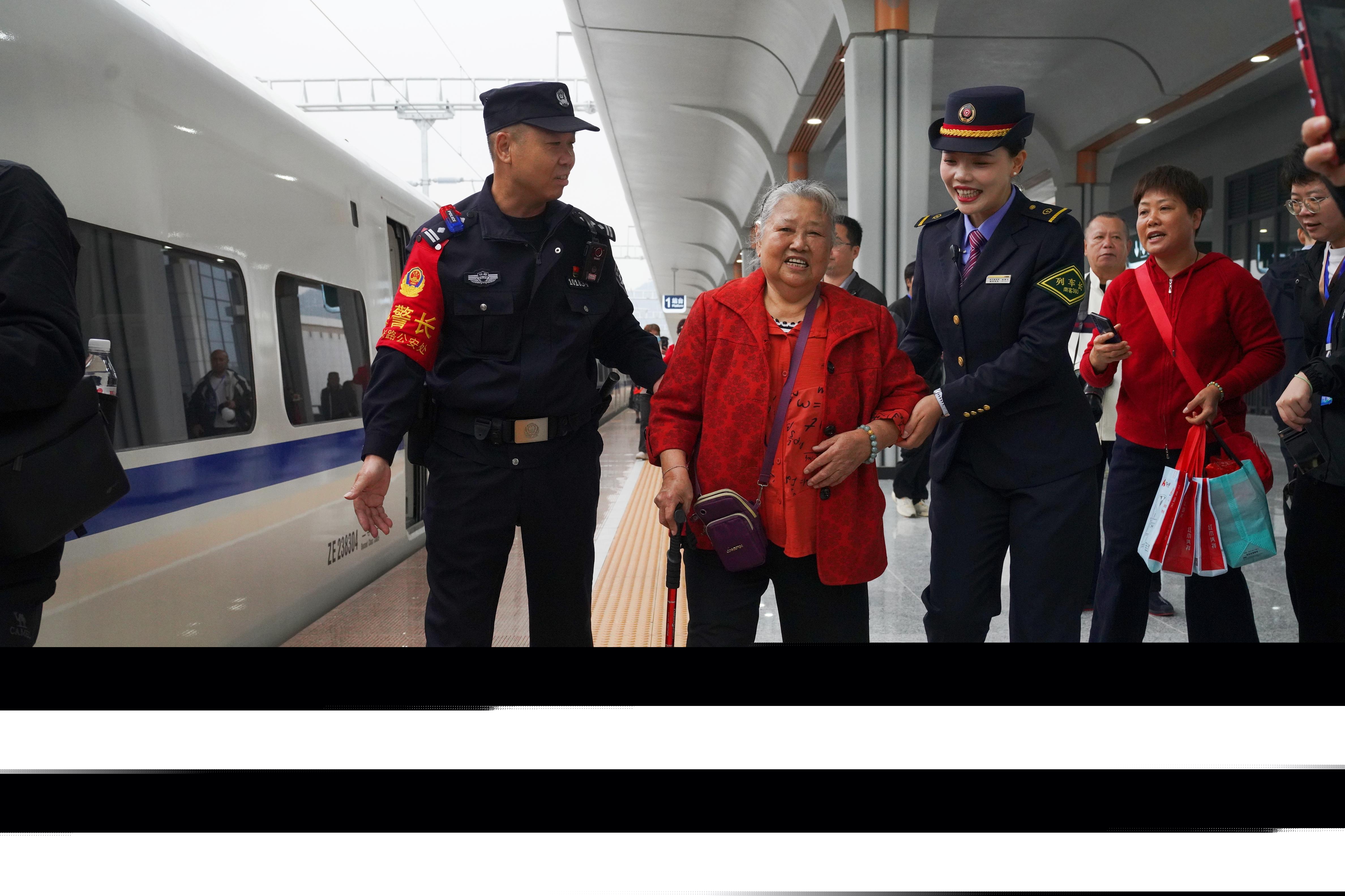 圖為乘警和列車員攙扶行動不便的老人上車。霍榆韜 攝