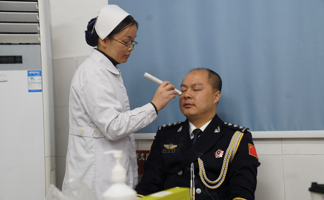 圖為南寧市中醫(yī)院醫(yī)護(hù)團(tuán)隊(duì)到南寧鐵路公安處開展義診活動(dòng),醫(yī)護(hù)人員為民警艾灸。強(qiáng)志儉 攝