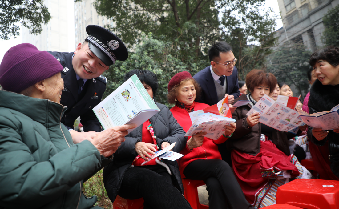 圖為1月17日,民警向社區(qū)居民宣傳反詐知識(shí)。