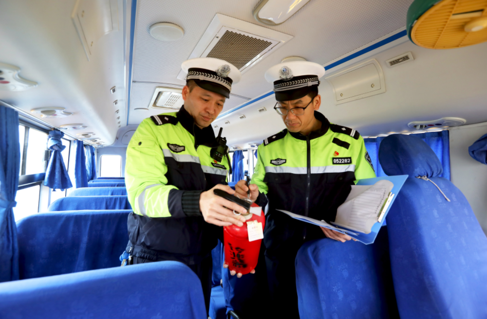 圖為2月27日,民警在分宜縣第六中學(xué)對(duì)校車進(jìn)行安全檢查。