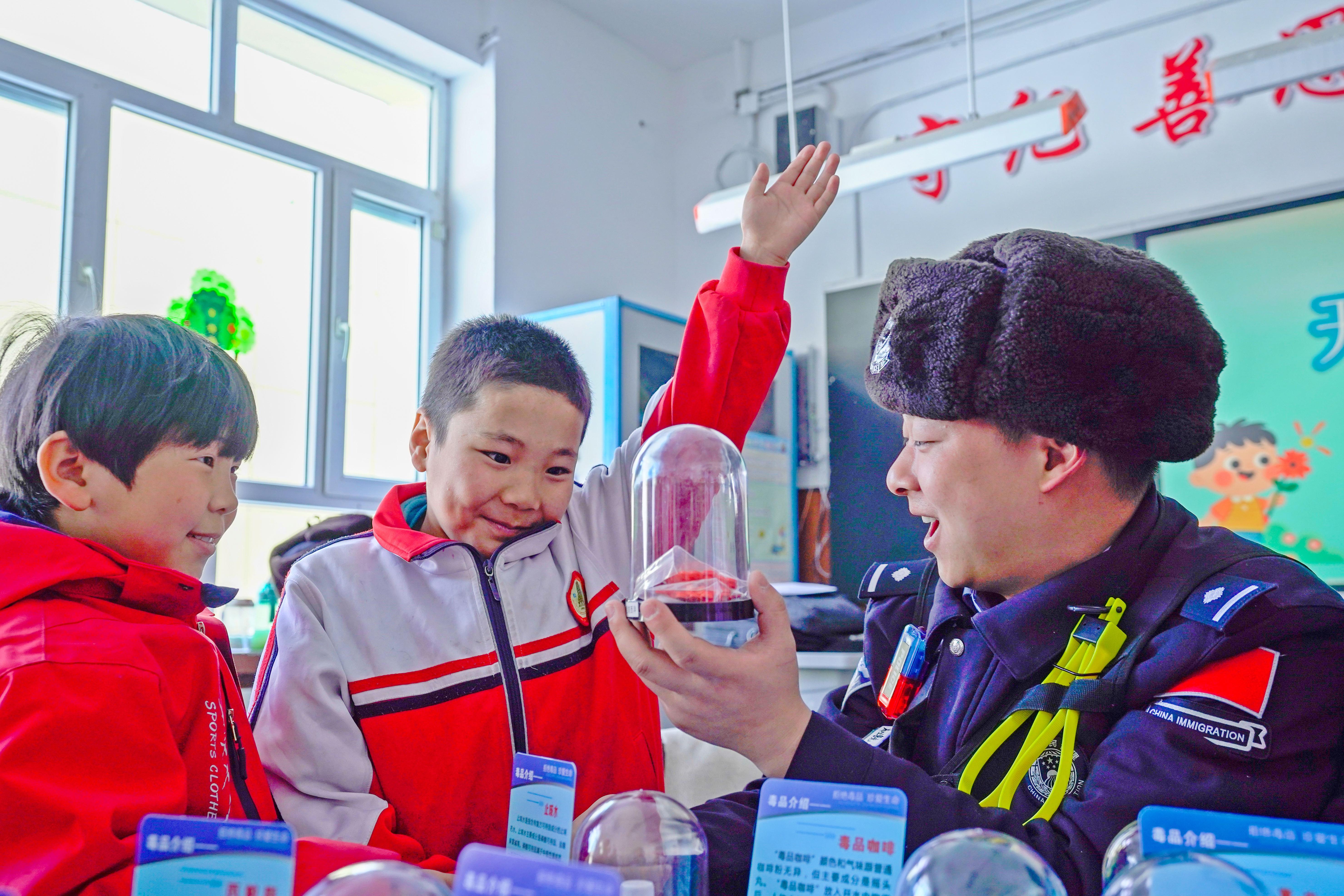 3月2日,新疆出入境邊防檢查總站昌吉邊境管理支隊(duì)庫(kù)甫邊境派出所和蘇吉邊境檢查站民警共同走進(jìn)北塔山牧場(chǎng)小學(xué)校,利用學(xué)校開(kāi)展“開(kāi)學(xué)第一課”法宣主題班會(huì)的時(shí)機(jī),向?qū)W校師生宣傳識(shí)毒防毒知識(shí)以及邊境管理相關(guān)法律知識(shí),在寓教于樂(lè)中,增強(qiáng)牧區(qū)小學(xué)師生識(shí)毒防毒及學(xué)法用法意識(shí)。