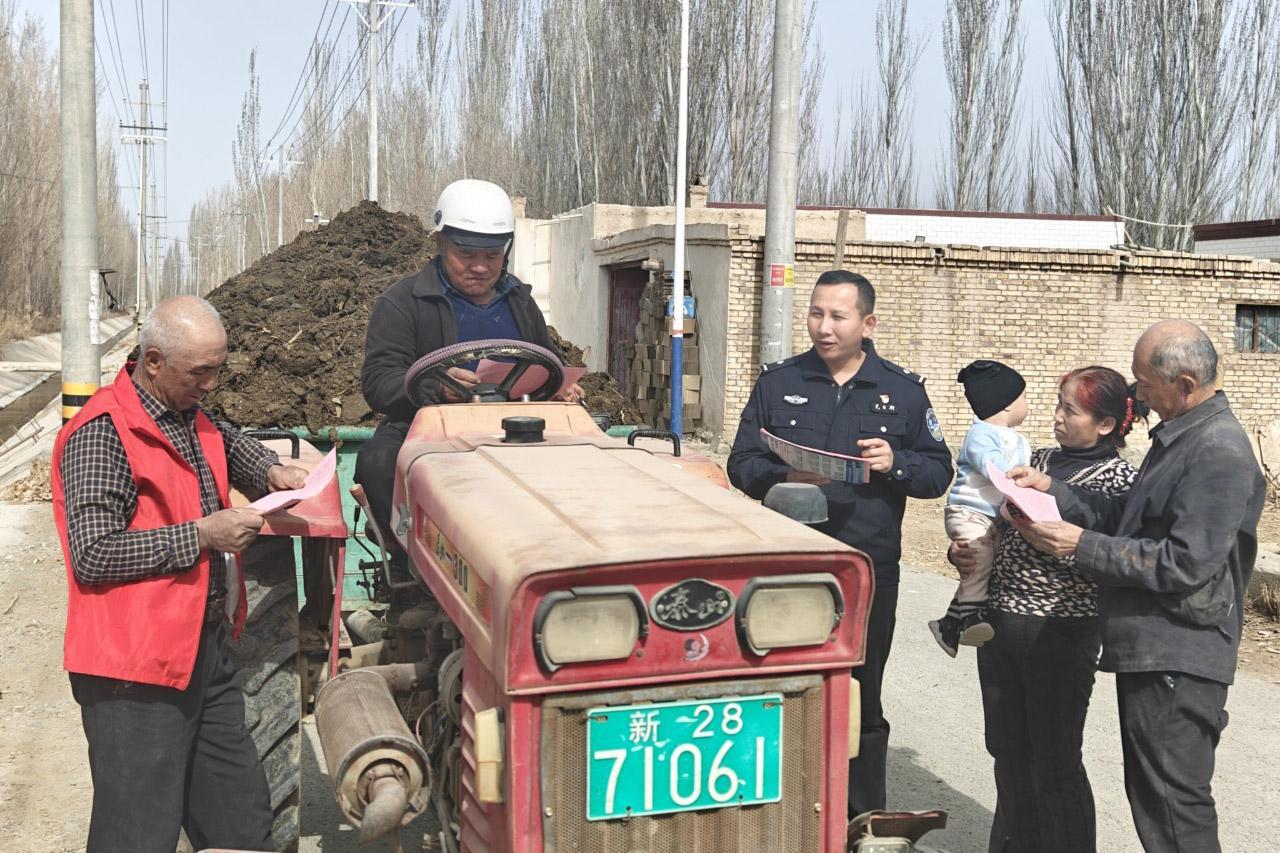 3月9日,新疆輪臺(tái)縣哈爾巴克鄉(xiāng)庫(kù)克色格孜村一蔬菜大棚內(nèi),輪臺(tái)縣公安局哈爾巴克鄉(xiāng)派出所民警瓦日斯·居麥一邊和村民聊著天,一邊反復(fù)叮囑安全和春耕注意事項(xiàng)。