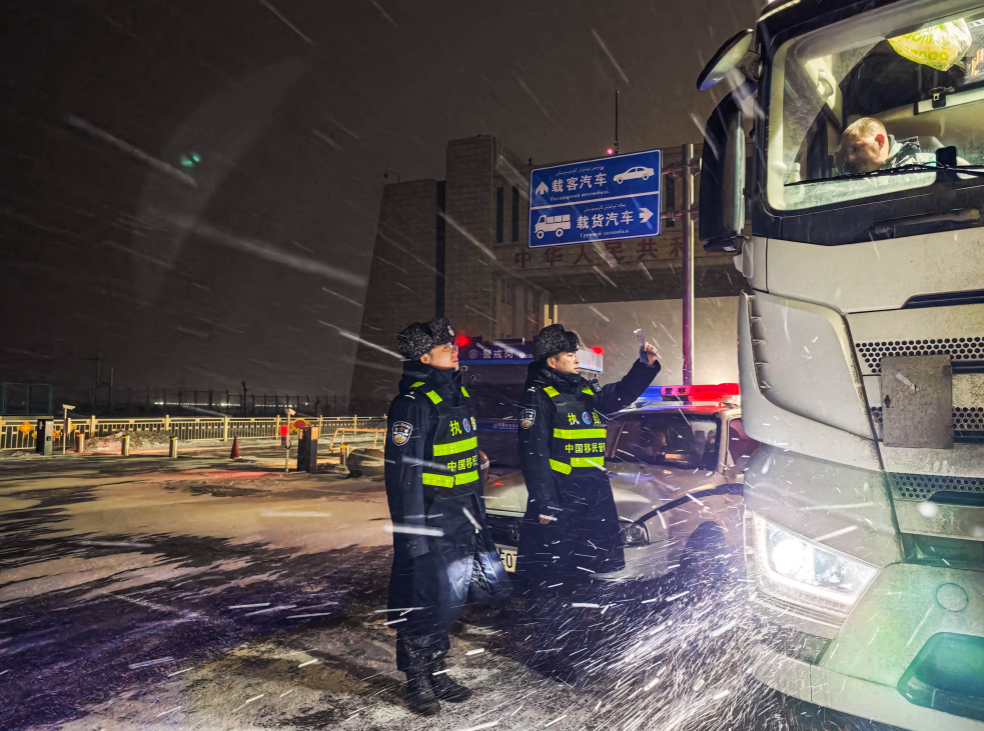 又一列滿載汽車配件的中歐班列緩緩?fù)??,幾名移民管理警察臂挽臂,艱難地頂風(fēng)迎上去,開(kāi)展車體安全檢查。
