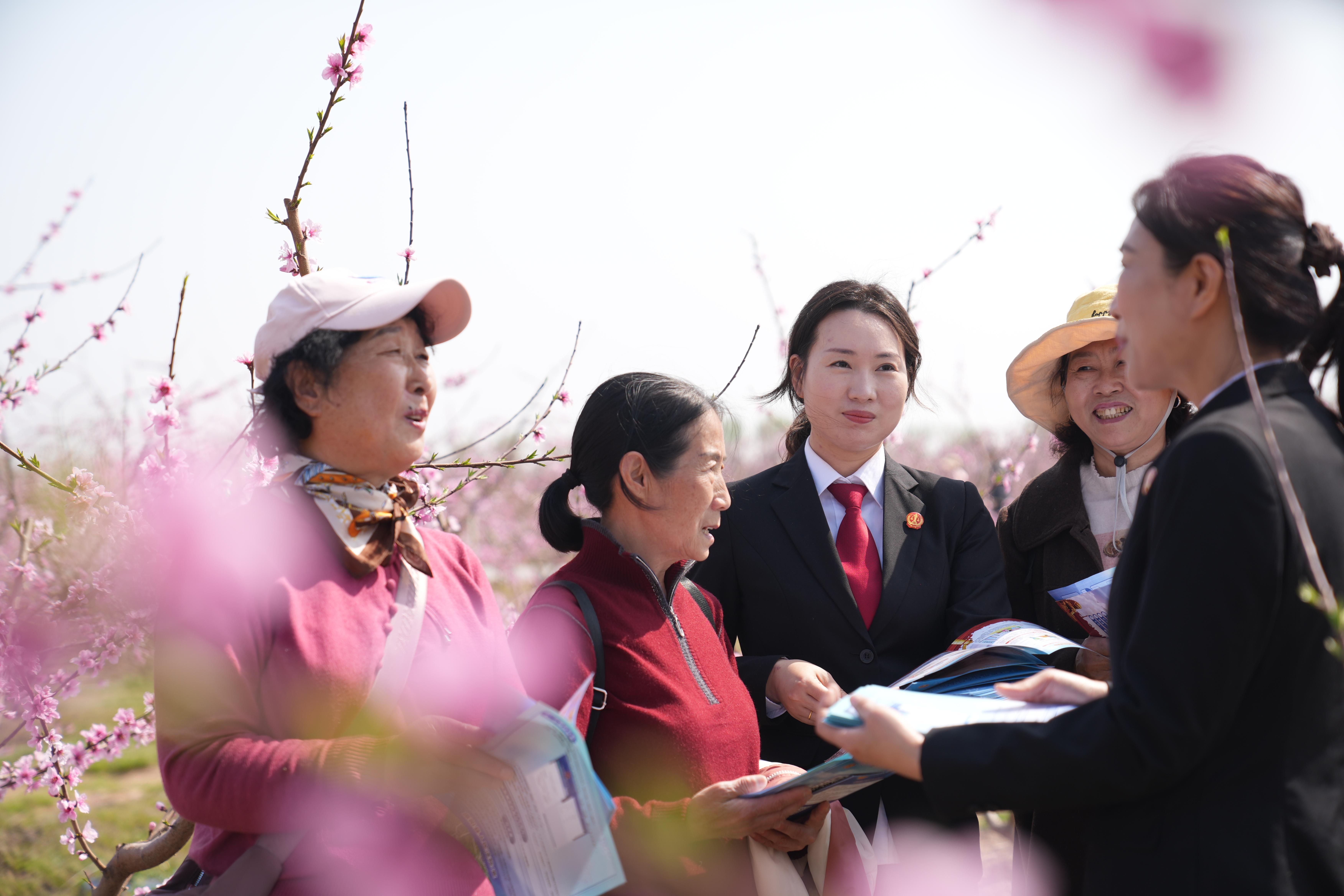圖為3月30日,新鄉(xiāng)市原陽縣橋北人民法庭干警在“鄉(xiāng)見·桃花源”觀景點向游客發(fā)放民法典、消費者權(quán)益保護法等法治宣傳資料。