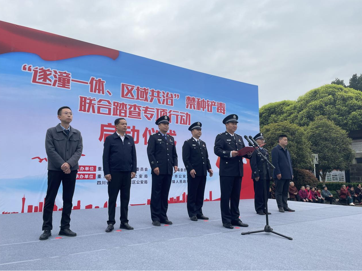 為進(jìn)一步鞏固川渝兩地禁毒工作成果,切實(shí)加強(qiáng)兩地禁毒工作的協(xié)作配合,堅(jiān)決遏制非法種植毒品原植物問(wèn)題反彈,力爭(zhēng)實(shí)現(xiàn)“遂潼一體化”非法種植毒品原植物基本禁絕的目標(biāo)。3月20日上午,川渝“遂潼一體、區(qū)域共治”禁種鏟毒聯(lián)合踏查專(zhuān)項(xiàng)行動(dòng)啟動(dòng)儀式在重慶市潼南區(qū)雙江鎮(zhèn)楊闇公舊居廣場(chǎng)舉行,全面拉開(kāi)兩地禁種鏟毒聯(lián)合踏查攻堅(jiān)戰(zhàn)的序幕。潼南區(qū)禁毒辦、潼南區(qū)公安局相關(guān)警種,四川省遂寧市禁毒辦、遂寧市安居區(qū)公安局相關(guān)警種,出席啟動(dòng)儀式。警用無(wú)人機(jī)專(zhuān)業(yè)操控人員,遂潼兩地毗鄰鎮(zhèn)(街道)代表、專(zhuān)職社工、禁毒志愿者代表200余人參加啟動(dòng)儀式。