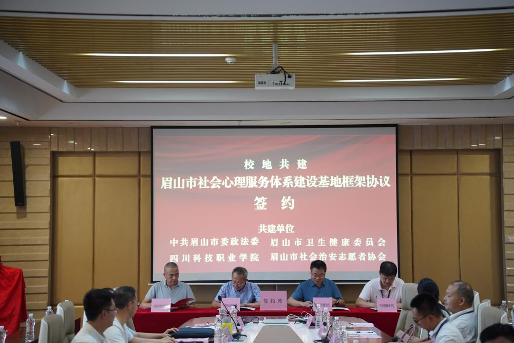 簽約儀式上,眉山市委政法委、市衛(wèi)生健康委、四川科技職業(yè)學(xué)院、市社會治安志愿者協(xié)會分別就進一步推動眉山市社會心理服務(wù)體系建設(shè)進行發(fā)言,共同簽署《共建眉山市社會心理服務(wù)體系建設(shè)基地框架協(xié)議》,并為四川科技職業(yè)學(xué)院“校地共建單位”揭牌和眉山市心理健康知識宣傳志愿服務(wù)隊授牌、授旗。