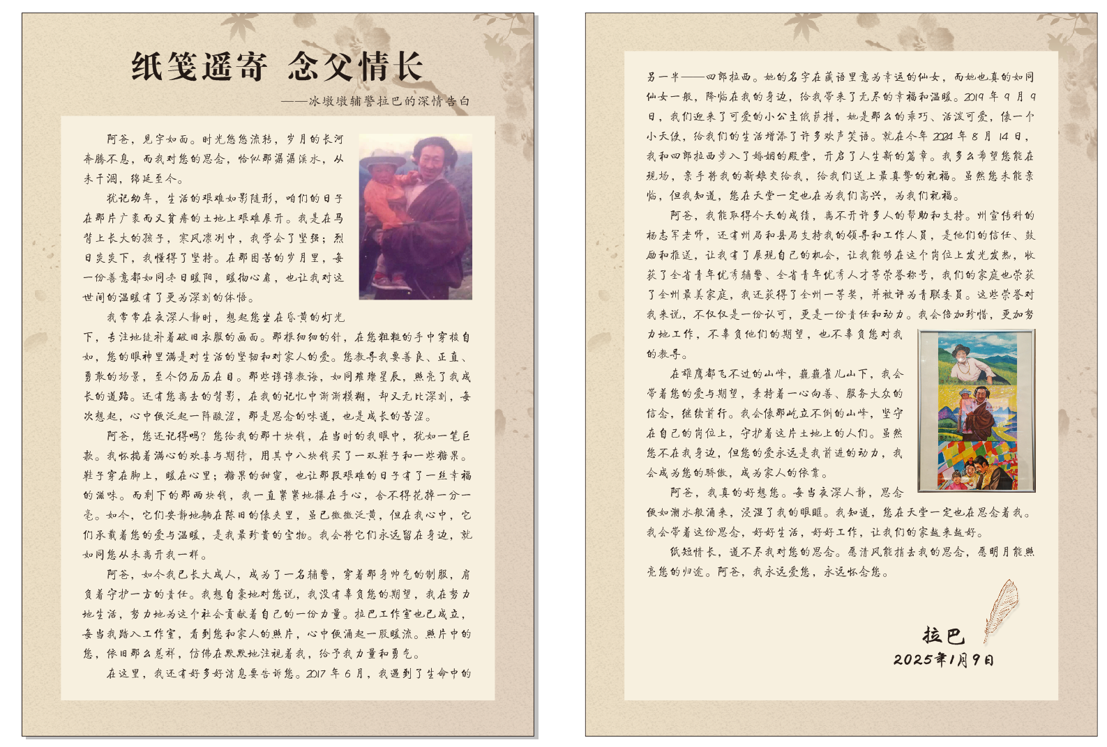 “阿爸,見(jiàn)字如面。時(shí)光悠悠流轉(zhuǎn),歲月的長(zhǎng)河奔騰不息,而我對(duì)您的思念,恰似那潺潺溪水,從未干涸,綿延至今。我常常在夜深人靜時(shí),想起您坐在昏黃的燈光下,專注地縫補(bǔ)著破舊衣服的畫(huà)面。那根細(xì)細(xì)的針,在您粗糙的手中穿梭自如,您的眼神里滿是對(duì)生活的堅(jiān)韌和對(duì)家人的愛(ài)。您教導(dǎo)我要善良、正直、勇敢的場(chǎng)景,至今仍歷歷在目。那些諄諄教誨,如同璀璨星辰,照亮了我成長(zhǎng)的道路。阿爸,您還記得嗎?您給我的那十塊錢(qián),在當(dāng)時(shí)的我眼中,猶如一筆巨款。我懷揣著滿心的歡喜與期待,用其中八塊錢(qián)買(mǎi)了一雙鞋子和一些糖果。鞋子穿在腳上,暖在心里;糖果的甜蜜,也讓那段艱難的日子有了一絲幸福的滋味。而剩下的那兩塊錢(qián),我一直緊緊地攥在手心,舍不得花掉一分一毫。如今,它們安靜地躺在陳舊的像夾里,雖已微微泛黃,但在我心中,它們承載著您的愛(ài)與溫暖,是我最珍貴的寶物。我會(huì)將它們永遠(yuǎn)留在身邊,就如同您從未離開(kāi)我一樣。在這里,我還有好多好消息要告訴您。2017年6月,我遇到了生命中的另一半——四郎拉西。她的名字在藏語(yǔ)里意為幸運(yùn)的仙女,而她也真的如同仙女一般,降臨在我的身邊,給我?guī)?lái)了無(wú)盡的幸福和溫暖。2019年9月9日,我們迎來(lái)了可愛(ài)的小公主俄薩措,她是那么的乖巧、活潑可愛(ài),像一個(gè)小天使,給我們的生活增添了許多歡聲笑語(yǔ)。在雄鷹都飛不過(guò)的山峰,巍巍雀兒山下,我會(huì)帶著您的愛(ài)與期望,秉持著一心向善、服務(wù)大眾的信念,繼續(xù)前行。我會(huì)像那屹立不倒的山峰,堅(jiān)守在自己的崗位上,守護(hù)著這片土地上的人們。雖然您不在我身邊,但您的愛(ài)永遠(yuǎn)是我前進(jìn)的動(dòng)力,我會(huì)成為您的驕傲,成為家人的依靠?!边@是一封來(lái)自德格縣的輔警拉巴寫(xiě)給父親的信,信件以樸素的詞匯表達(dá)了對(duì)已故父親的思念,以及自己將謹(jǐn)遵父親教誨,努力在崗位上發(fā)光發(fā)熱的決心。