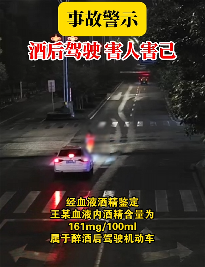 接到報警后,樂山市夾江縣公安局交通管理大隊事故中隊民警迅速趕往現(xiàn)場處置,發(fā)現(xiàn)駕駛?cè)送跄成嫦泳坪篑{駛機動車,并依法將王某帶至醫(yī)院提取血樣。經(jīng)鑒定,王某血液內(nèi)酒精含量為161mg/100ml。王某因犯危險駕駛罪,被夾江縣人民法院依法判處拘役2個月,緩刑3個月,并處罰金3000元。同時,公安機關(guān)交通管理部門依法對王某做出吊銷機動車駕駛證,五年內(nèi)不得重新取得機動車駕駛證的行政處罰。