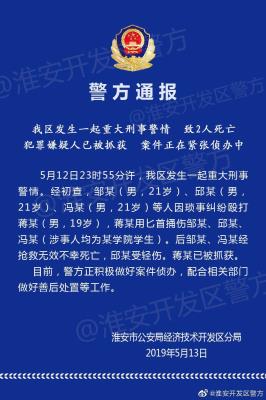 法制網(wǎng)訊 記者羅莎莎 @淮安開發(fā)區(qū)警方官方微博5月13日發(fā)布通報(bào),5月12日23時(shí)55分許,該區(qū)發(fā)生一起重大刑事警情。經(jīng)初查,鄒某(男,21歲)、邱某(男21歲)、馮某(男,21歲)等人因瑣事糾紛毆打蔣某(男,19歲),蔣某用匕首捅傷鄒某、邱某、馮某(涉事人均為某學(xué)院學(xué)生)。后鄒某、馮某經(jīng)搶救無(wú)效不幸死亡,邱某受輕傷。目前,蔣某已被抓獲,警方正積極做好案件偵辦,配合相關(guān)部門做好善后處置等工作。