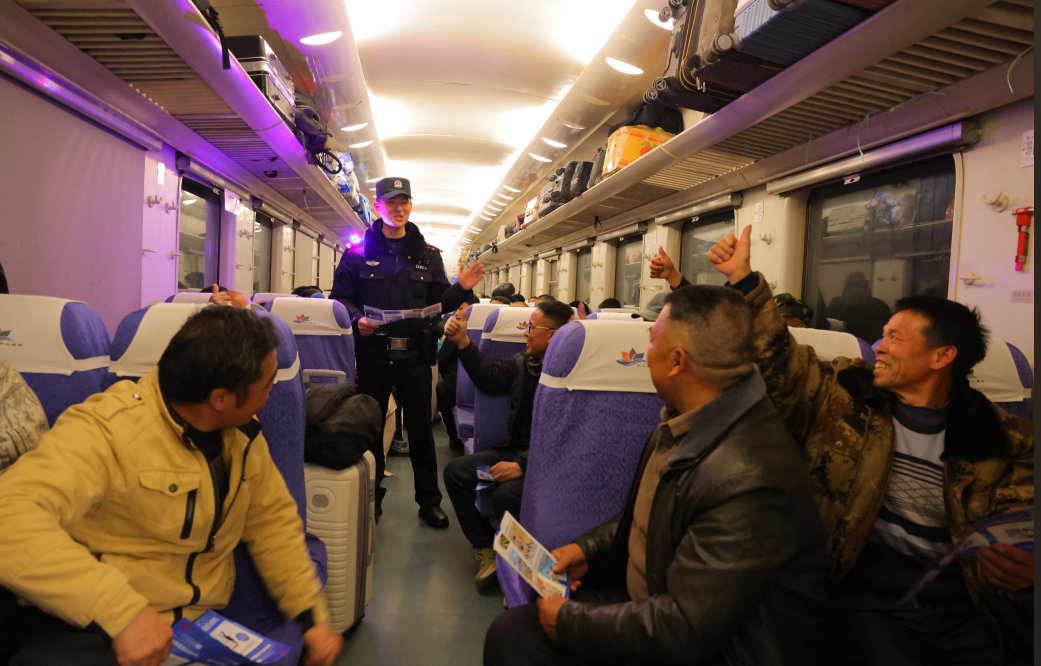 為確保該趟列車平安運行,庫爾勒鐵路公安處乘警支隊以“開車后反電詐宣傳、熄燈前人身安全提醒、熄燈后巡視震懾、到站前財物安全提示”的閉環(huán)舉措,構(gòu)建了“乘警+列車長+檢車員”的三級聯(lián)防體系,讓平安氛圍充盈車廂。