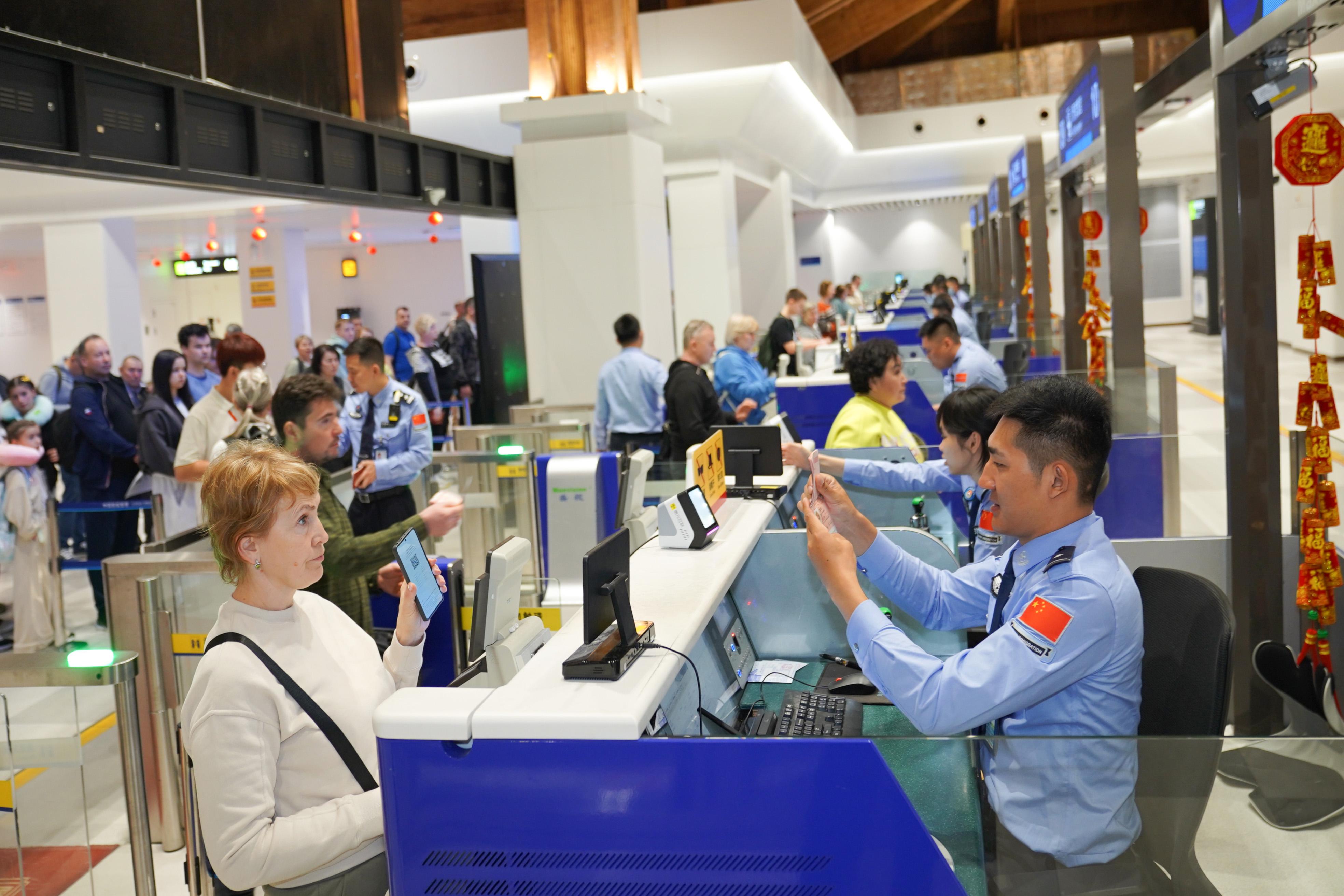 “謝—謝—!”一位正在辦理出境手續(xù)的俄羅斯旅客,耐心教懷抱中的孩子用中文向民警表達(dá)謝意。在這里,許多俄羅斯旅客即便不會說英語,也能熟練用中文說一句“謝謝”。