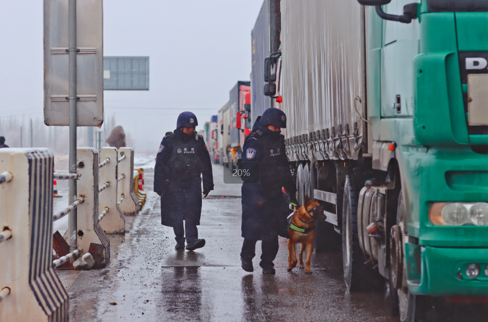 3月20日,新疆克州邊境管理支隊康蘇邊境檢查站民警頂風(fēng)冒雪查驗出入境貿(mào)易貨車,面對惡劣天氣,民警堅守崗位,確保貨運車輛順利通關(guān)。