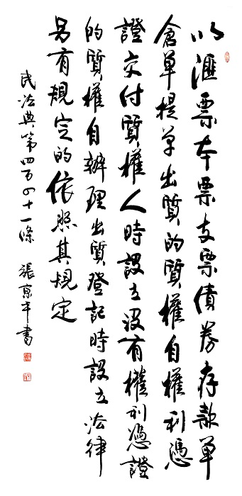 民法典第四百四十一條 以匯票、本票、支票、債券、存款單、倉(cāng)單、提單出質(zhì)的,質(zhì)權(quán)自權(quán)利憑證交付質(zhì)權(quán)人時(shí)設(shè)立;沒有權(quán)利憑證的,質(zhì)權(quán)自辦理出質(zhì)登記時(shí)設(shè)立。法律另有規(guī)定的,依照其規(guī)定。