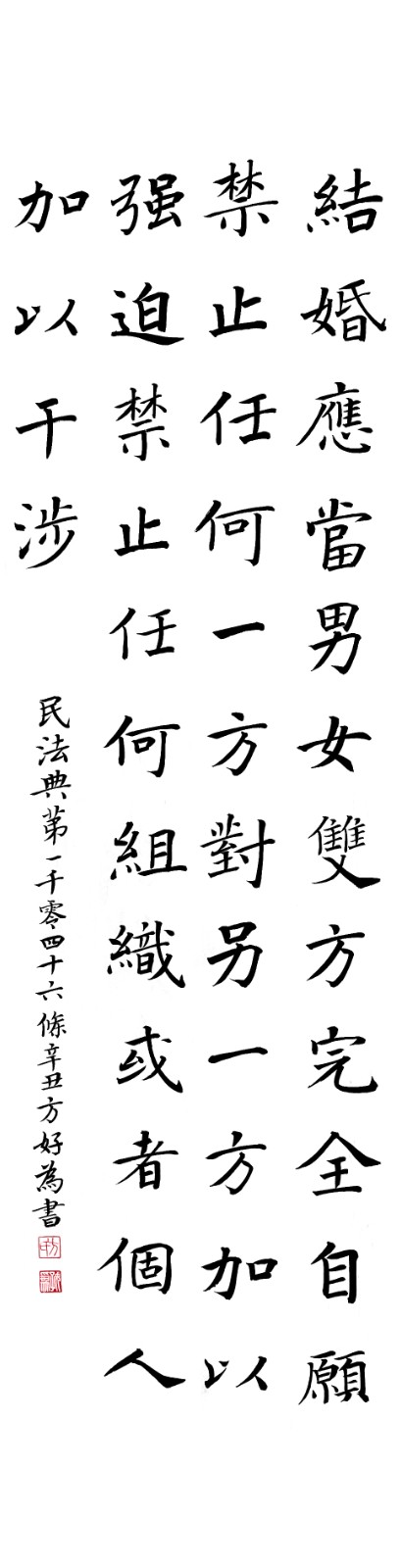 民法典第一千零四十六條 結(jié)婚應(yīng)當(dāng)男女雙方完全自愿,禁止任何一方對另一方加以強(qiáng)迫,禁止任何組織或者個人加以干涉。