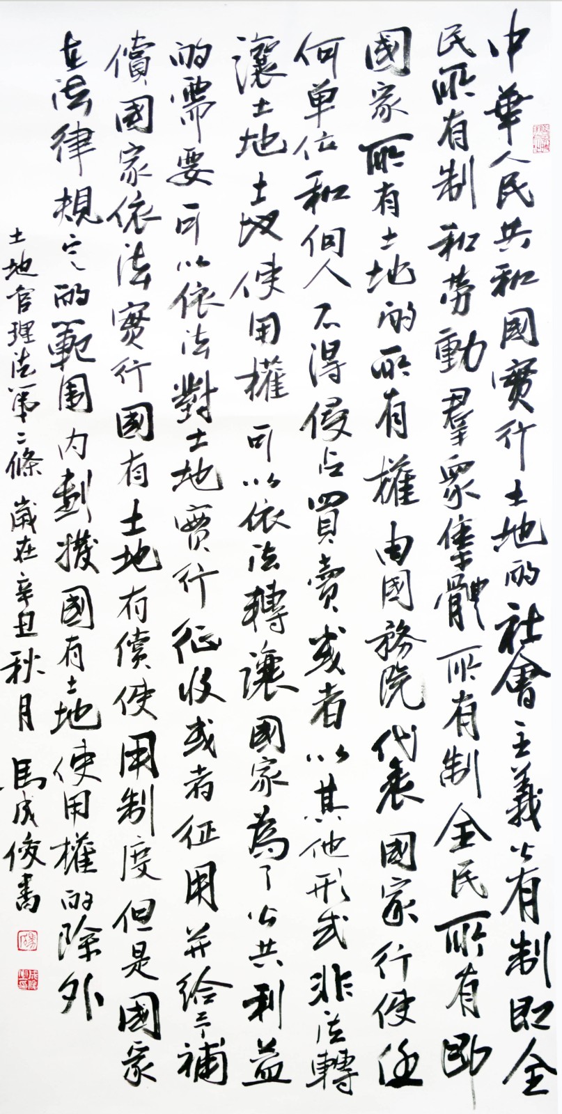 繼1600余位書法家參與書寫《中華人民共和國民法典》全部1260條法條之后,法治日?qǐng)?bào)社聯(lián)合自然資源部法規(guī)司、自然資源部書畫研究會(huì)和北京昌平書法家協(xié)會(huì),將筆端對(duì)準(zhǔn)土地管理“一法一條例”,即《中華人民共和國土地管理法》和《中華人民共和國土地管理法實(shí)施條例》。