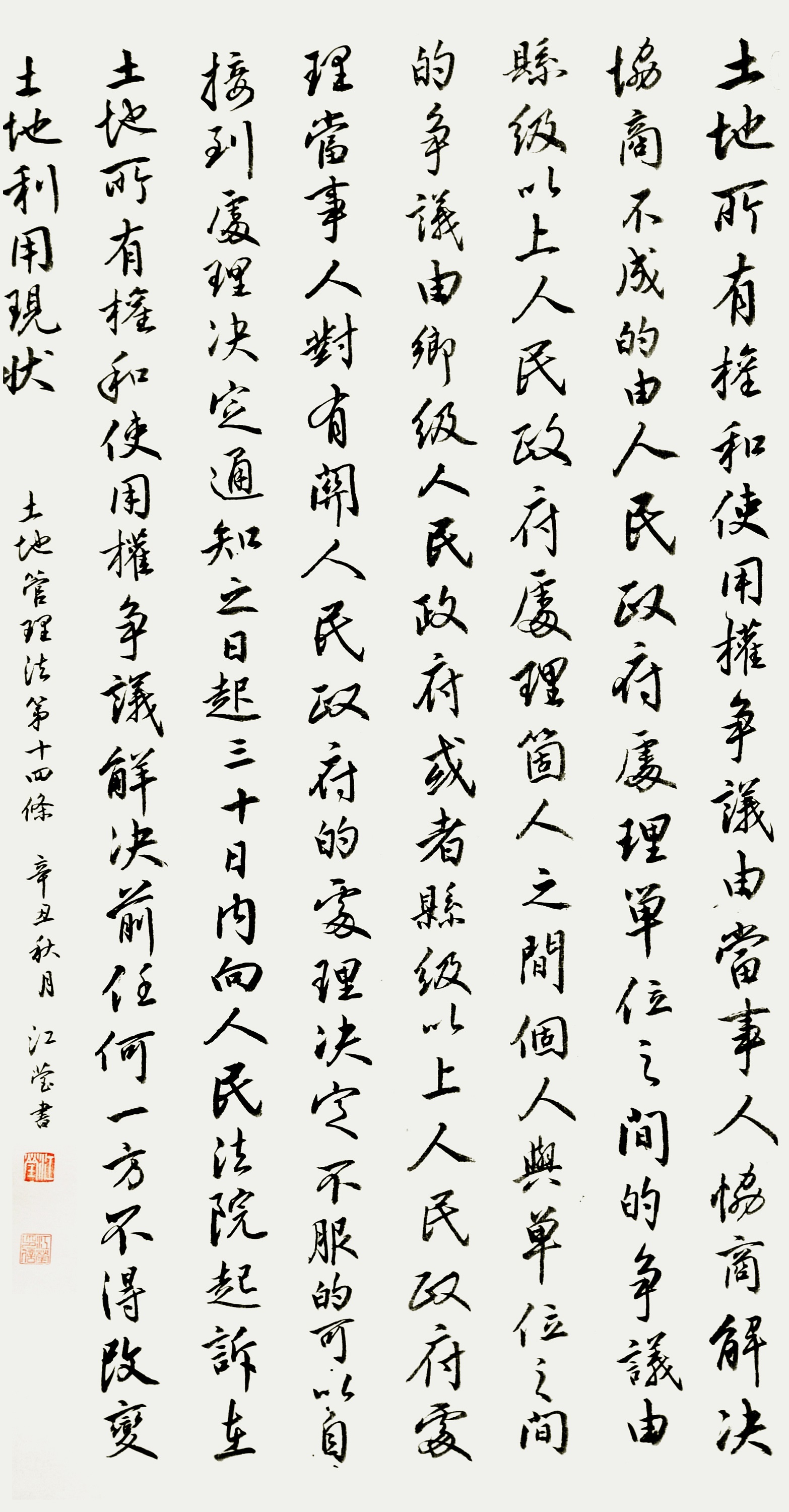繼1600余位書法家參與書寫《中華人民共和國民法典》全部1260條法條之后,法治日報社聯(lián)合自然資源部法規(guī)司、自然資源部書畫研究會和北京昌平書法家協(xié)會,將筆端對準(zhǔn)土地管理“一法一條例”,即《中華人民共和國土地管理法》和《中華人民共和國土地管理法實施條例》。