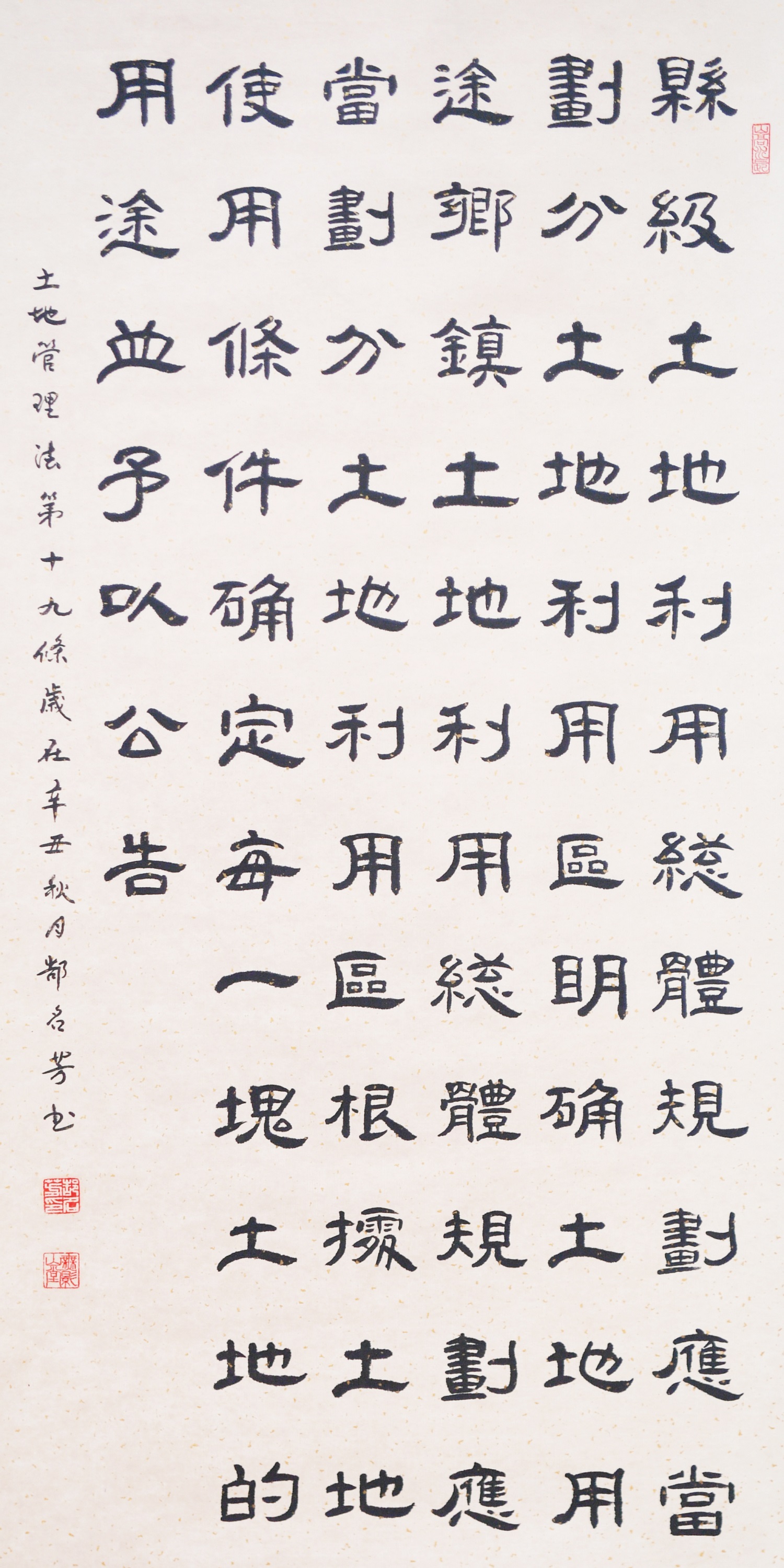 繼1600余位書法家參與書寫《中華人民共和國民法典》全部1260條法條之后,法治日?qǐng)?bào)社聯(lián)合自然資源部法規(guī)司、自然資源部書畫研究會(huì)和北京昌平書法家協(xié)會(huì),將筆端對(duì)準(zhǔn)土地管理“一法一條例”,即《中華人民共和國土地管理法》和《中華人民共和國土地管理法實(shí)施條例》。