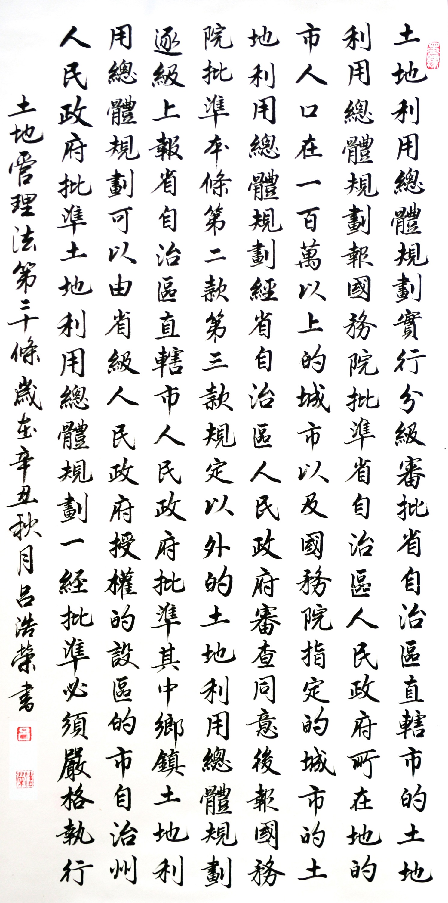 繼1600余位書法家參與書寫《中華人民共和國民法典》全部1260條法條之后,法治日報社聯(lián)合自然資源部法規(guī)司、自然資源部書畫研究會和北京昌平書法家協(xié)會,將筆端對準土地管理“一法一條例”,即《中華人民共和國土地管理法》和《中華人民共和國土地管理法實施條例》。