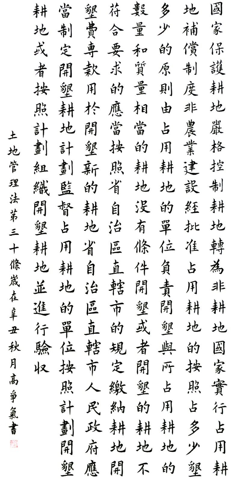 繼1600余位書法家參與書寫《中華人民共和國民法典》全部1260條法條之后,法治日報社聯(lián)合自然資源部法規(guī)司、自然資源部書畫研究會和北京昌平書法家協(xié)會,將筆端對準(zhǔn)土地管理“一法一條例”,即《中華人民共和國土地管理法》和《中華人民共和國土地管理法實施條例》。