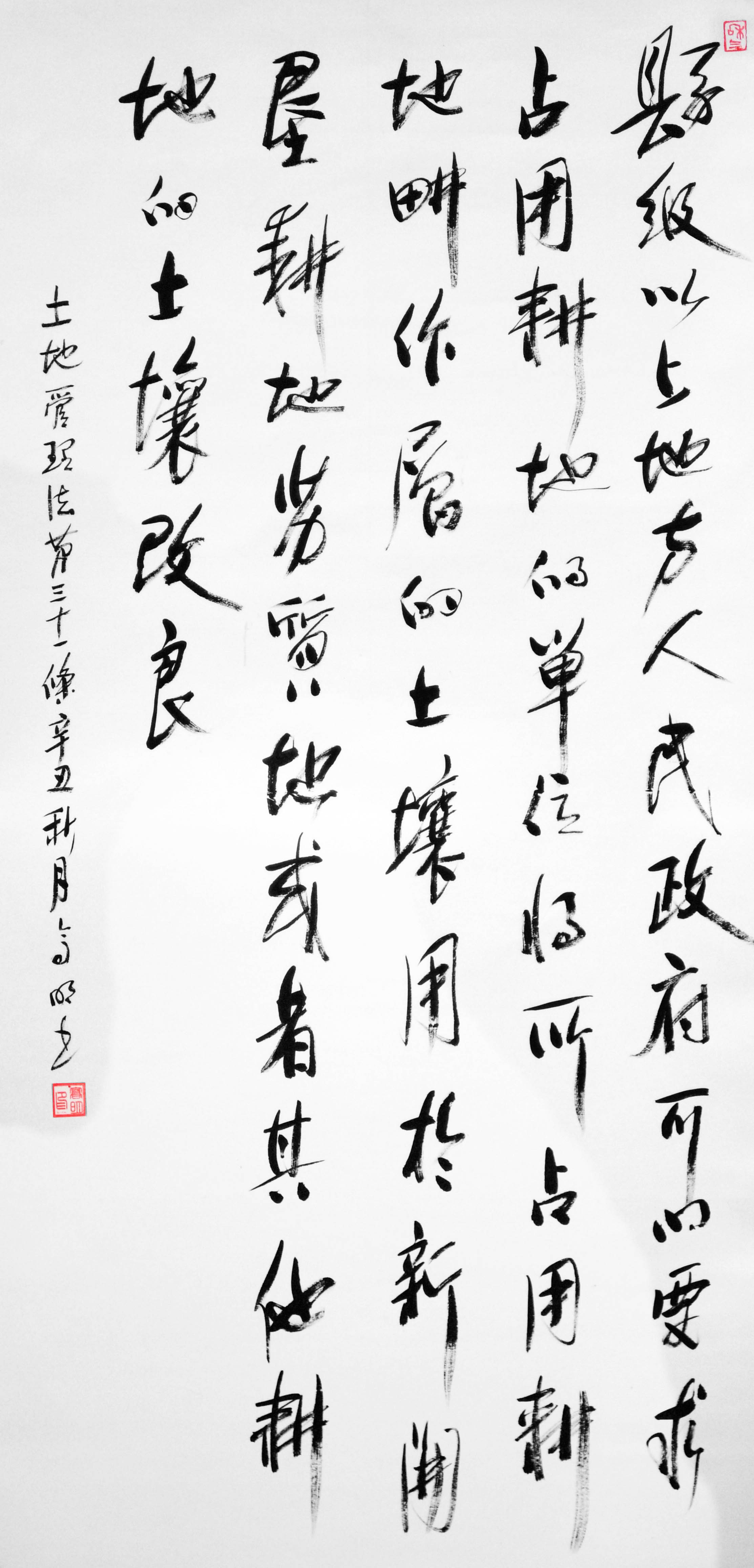 繼1600余位書法家參與書寫《中華人民共和國民法典》全部1260條法條之后,法治日?qǐng)?bào)社聯(lián)合自然資源部法規(guī)司、自然資源部書畫研究會(huì)和北京昌平書法家協(xié)會(huì),將筆端對(duì)準(zhǔn)土地管理“一法一條例”,即《中華人民共和國土地管理法》和《中華人民共和國土地管理法實(shí)施條例》。